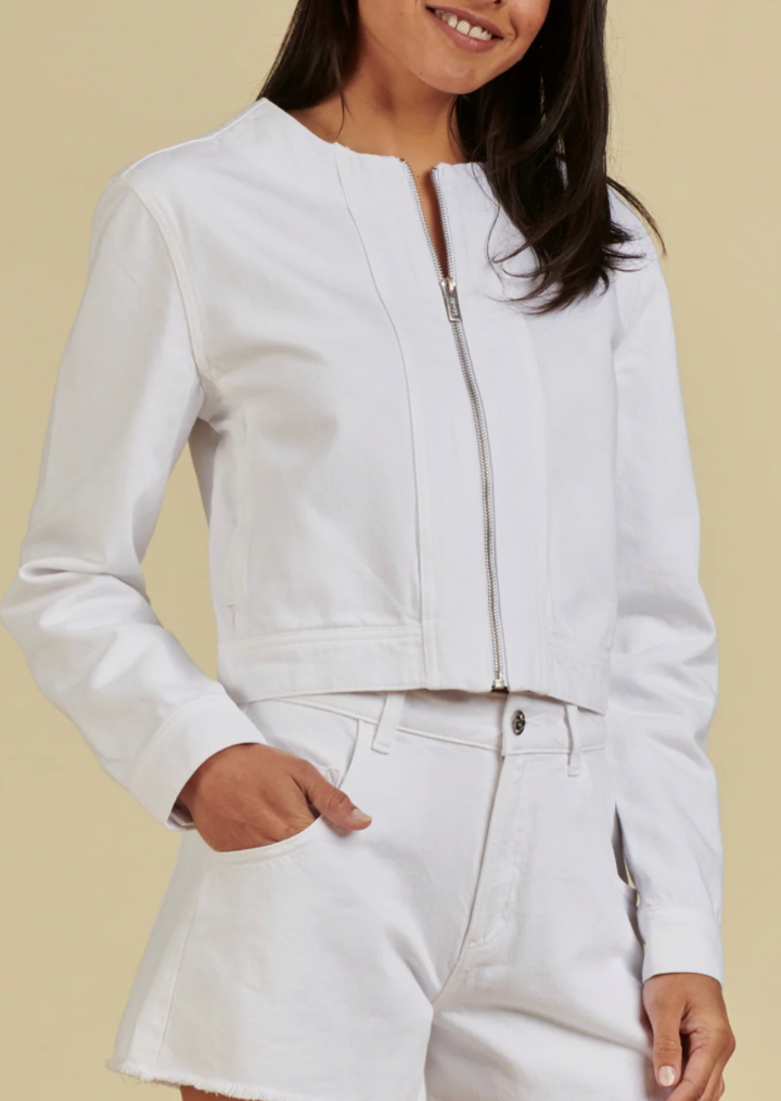 Whether for a girls' night out or a stylish casual look, the Drew Denim Jacket will keep you looking sharp and feeling cozy! This fun bright white denim jacket offers a front zipper closure, side pockets, and a cropped length. Pairs well over any summer sun dress or with denim and colored chinos.