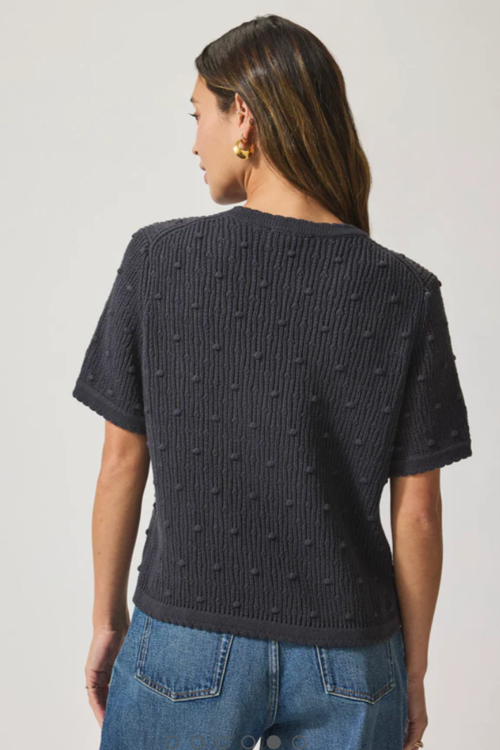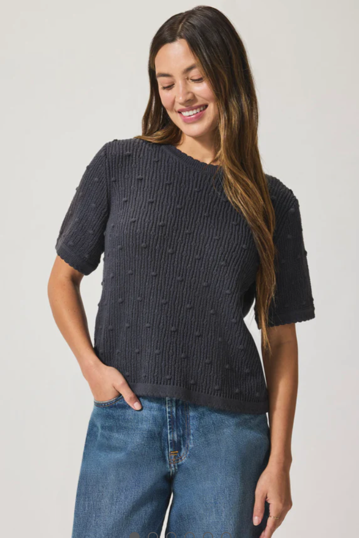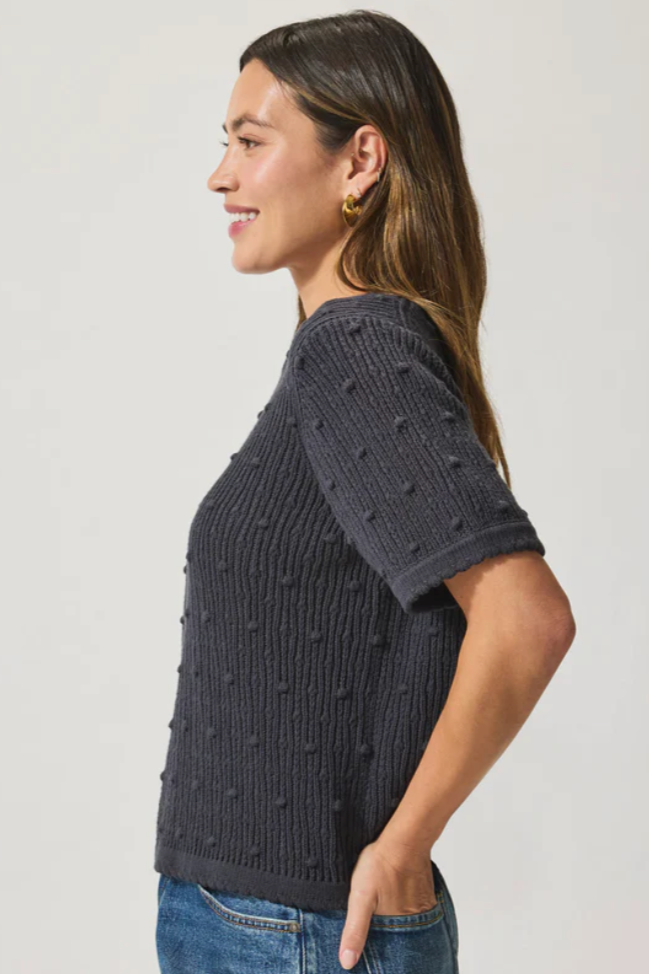 Introducing the Eliza Sweater—Lead, a stylish and cozy crewneck sweater. Made from a soft cotton blend, this top features charming bobble detailing and scalloped edges. The puff sleeves add a touch of joy to any outfit. Perfect for pairing with denim for a casual yet chic look.