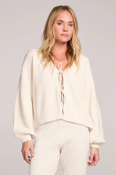 The Ellyn Cardigan Sweater features elegant bow closures and roomy blouson sleeves, offering sophisticated detailing that elevates any outfit.
