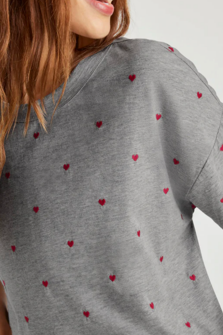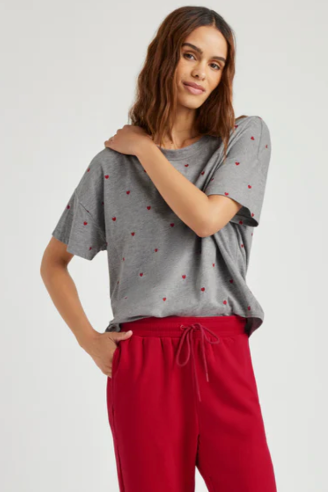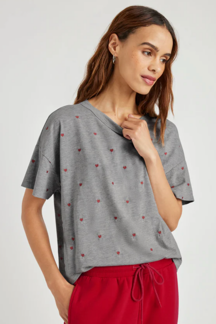 This Embroidered Hearts Tee is sure to brighten your day. The oversized fit provides comfort and the soft jersey fabric is lightweight. It features adorable embroidered hearts all over, adding a playful touch to the classic heather grey color. Perfect for adding some fun to your everyday look.