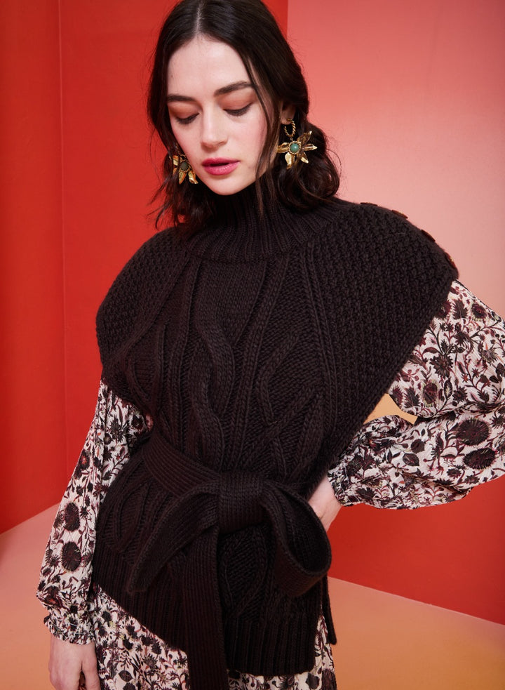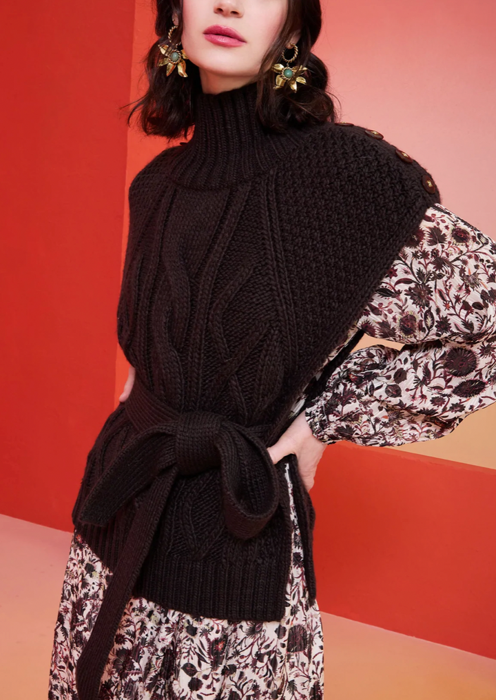 The best layer to wear with denim or even over a cocktail dress this winter. Featuring tortoise shell buttons at the shoulder, a tie belt, and wide ribbed mock neckline.