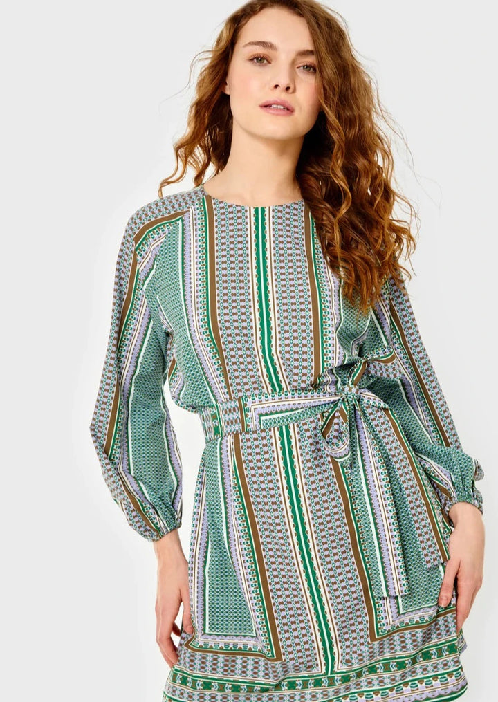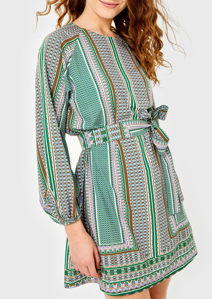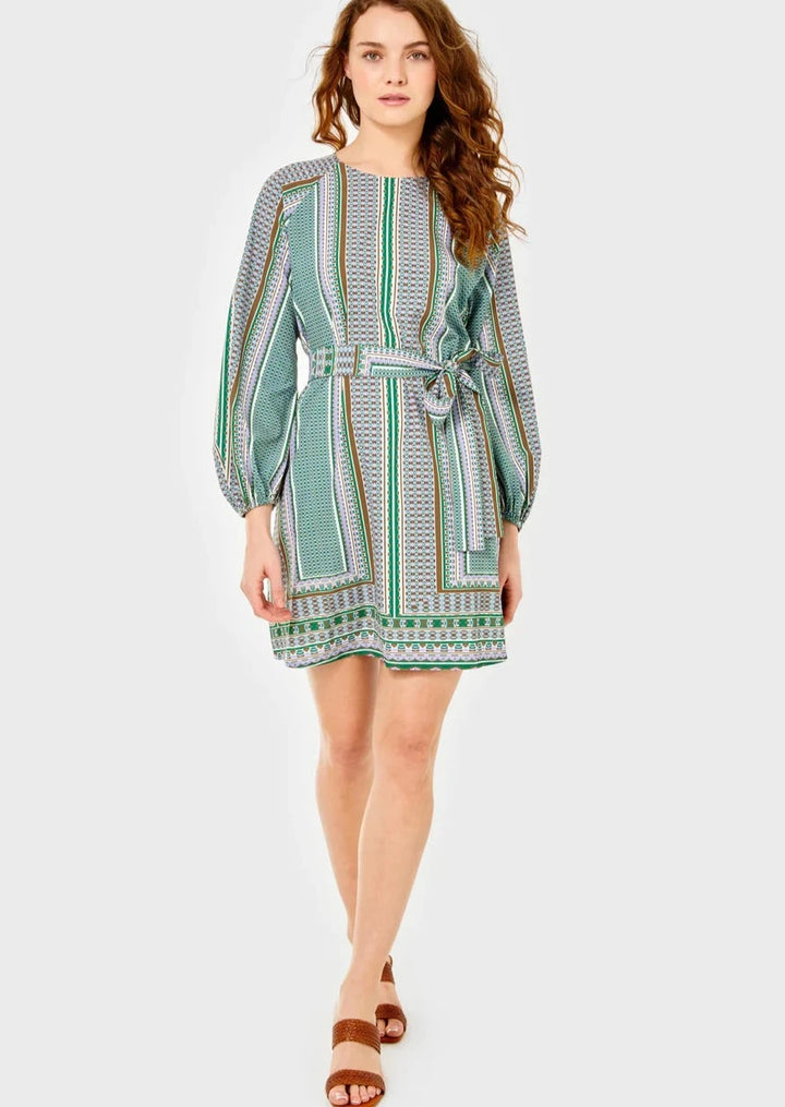Meet the Emma Dress- Eze: a Cartolina best-selling style with a new Mediterranean inspired print. Dress it up or down with long raglan sleeves and a removable matching silk belt. Plus, the keyhole back closure adds a touch of charm. Perfect for any occasion!