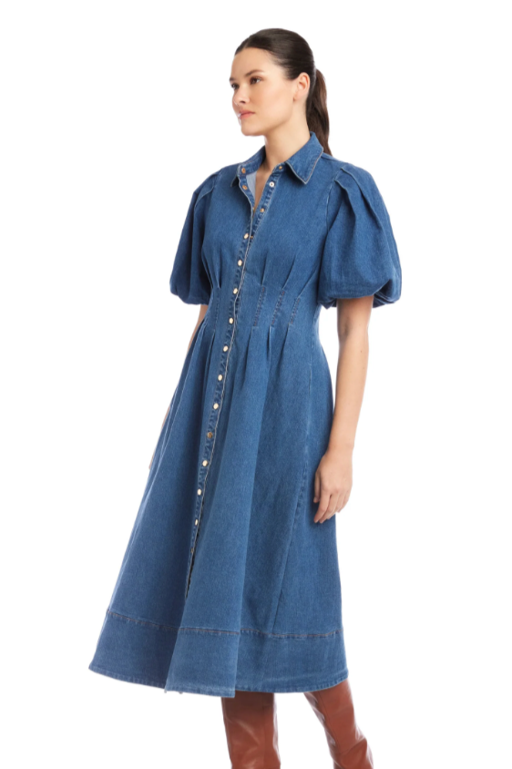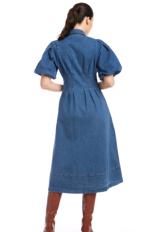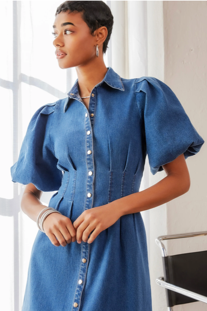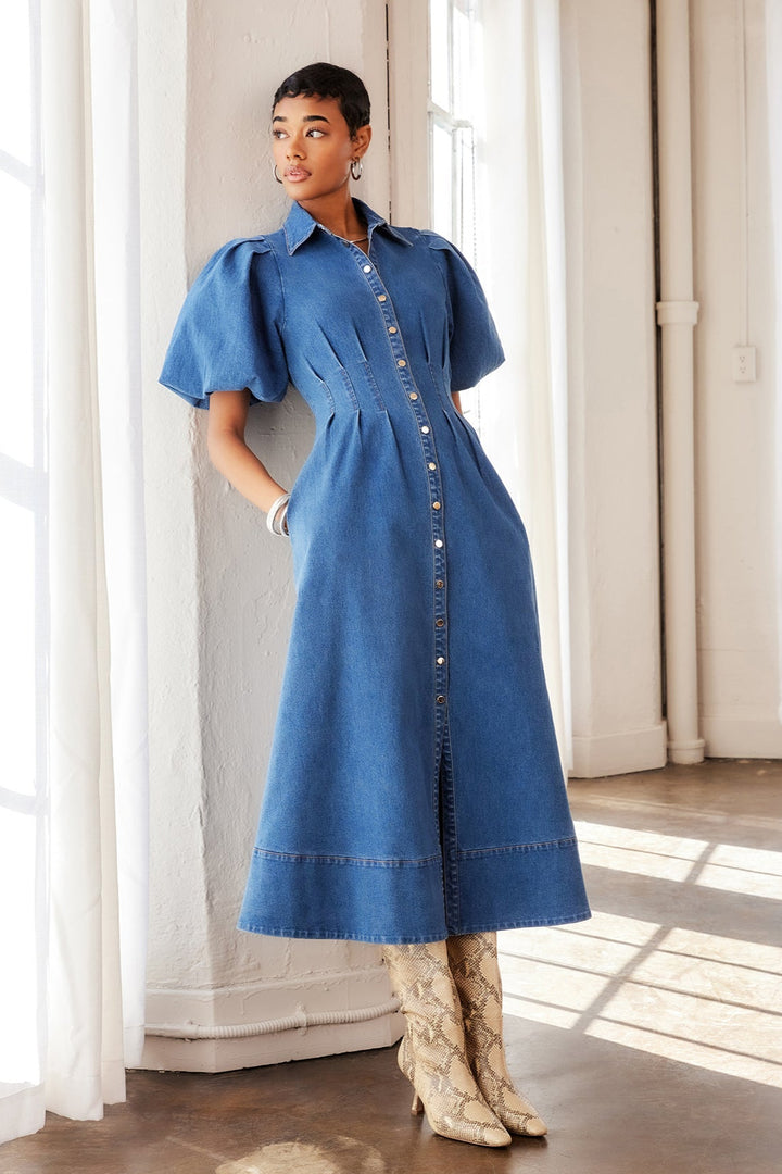 Slip into the Esme Midi Shirt Dress for a playful twist on classic denim. Crafted from stretchy denim, it moves with you for all-day comfort. Puff sleeves with cozy lining add a fun, flirty shape, while the pointed collar and snap-button front keep things sharp. Princess seams highlight your waist, and the wide hem plus handy side pockets bring both style and function to this flattering midi silhouette. Perfect for turning heads with ease!