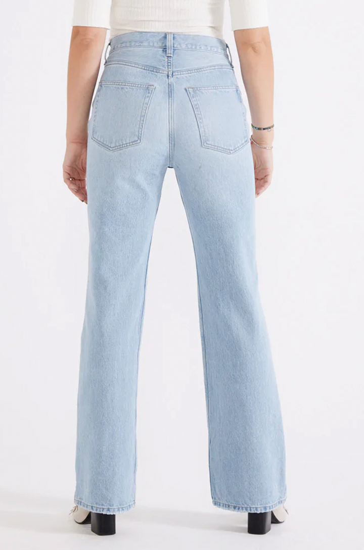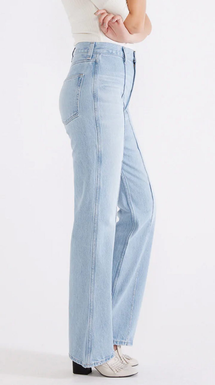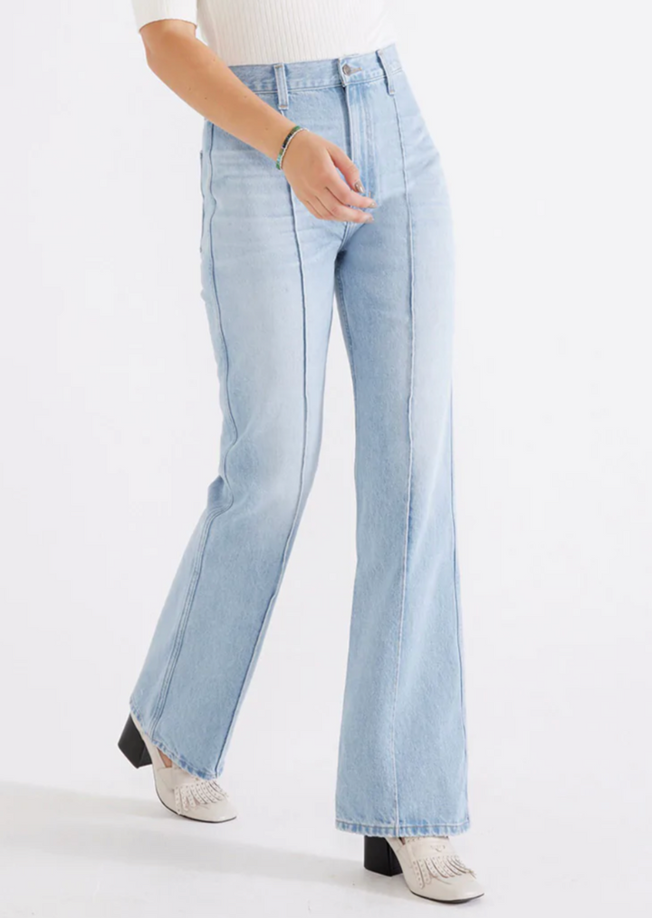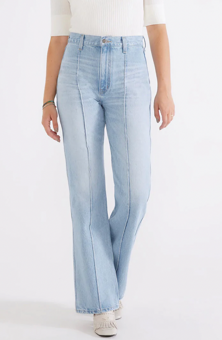 High waist medium weight denim with minimal stretch. These light wash jeans feature a front pintuck seam down the front with a wider subtly flared leg. Dress these trouser pants up or down. 11.5" front rise, 32" inseam, 20" leg opening