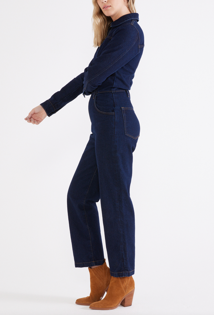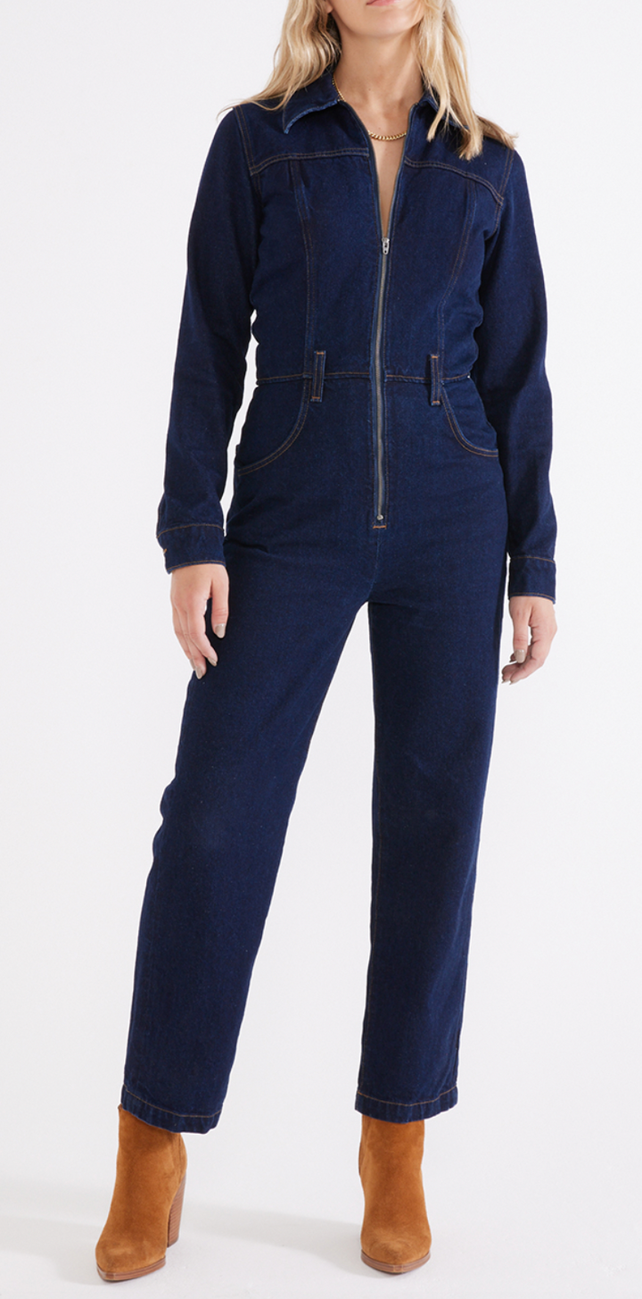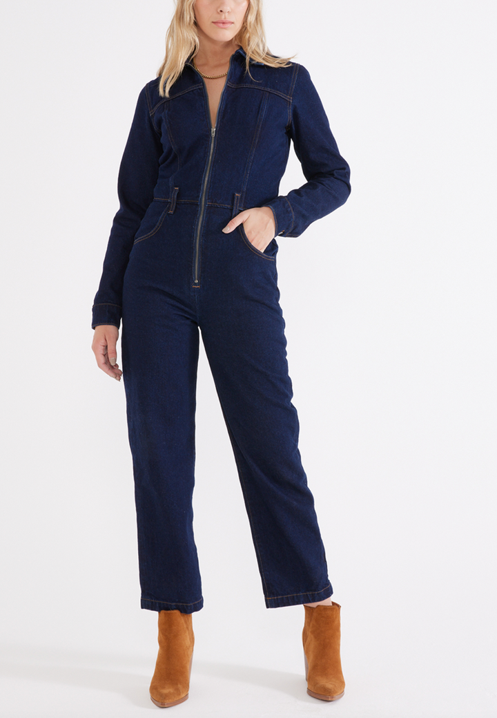 Beautiful 70's inspired jumpsuit with a spread collar, zip front and long sleeves. The straight leg pant leg is slightly cropped and should hit above your ankle. Pair with heels, booties or white tennis shoes!