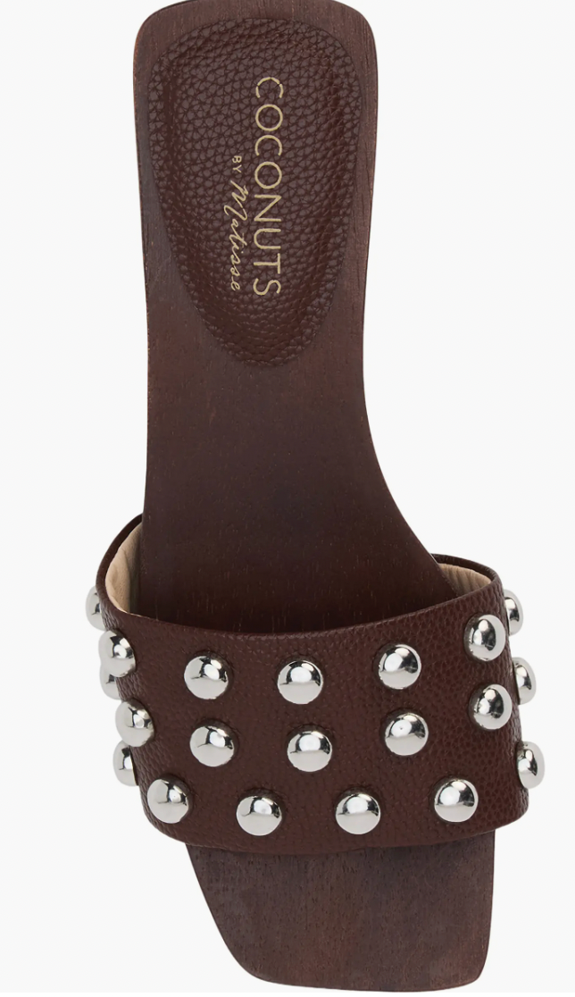 Elevate your casual rotation with the Fiora Studded Slide Sandal in rich chocolate. Polished dome studs accent a single faux-leather strap, delivering retro-inspired style with a modern edge. The square toe silhouette and boho-influenced wood-grain block heel create an effortless, grounded aesthetic that transitions seamlessly from weekend errands to laid-back gatherings. A versatile essential for premium casual dressing.