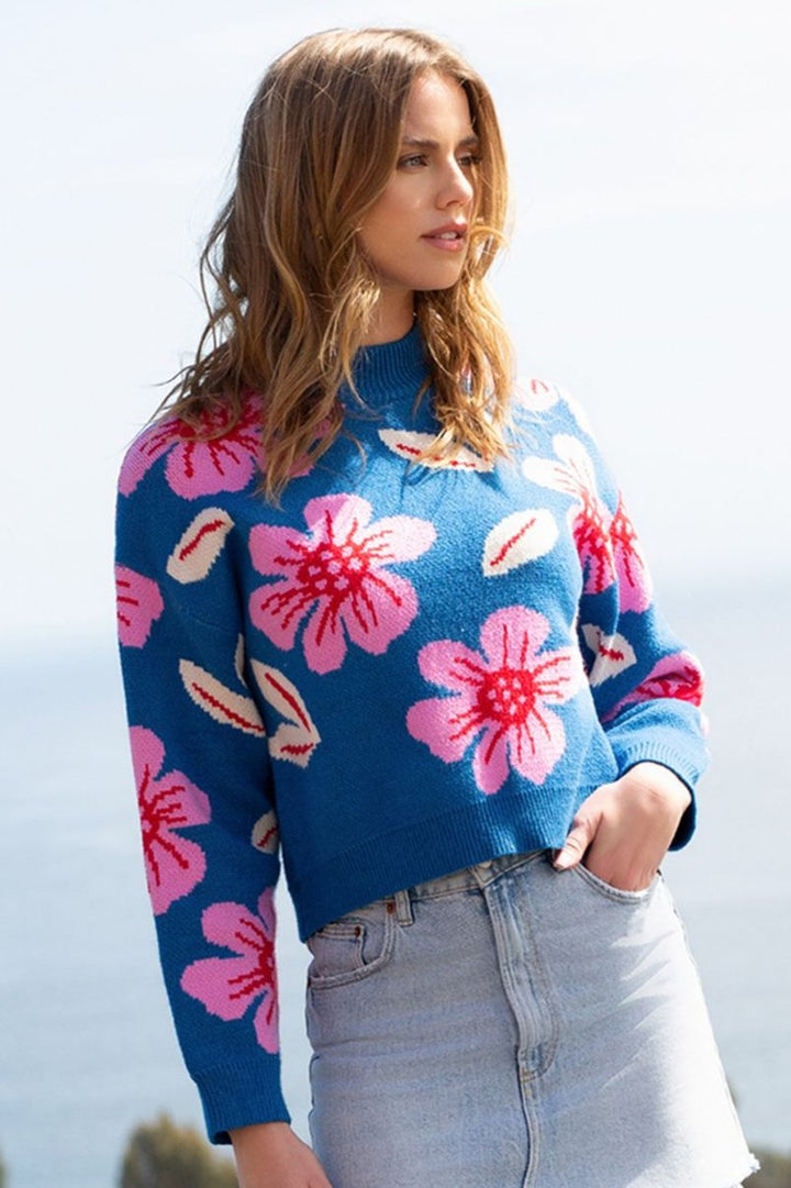 Add a pop of color to your wardrobe with our Flower Knit Sweater! The bright blue background and bold floral print are perfect for a playful look. With a slightly cropped length, this sweater is versatile for both work and weekend wear.