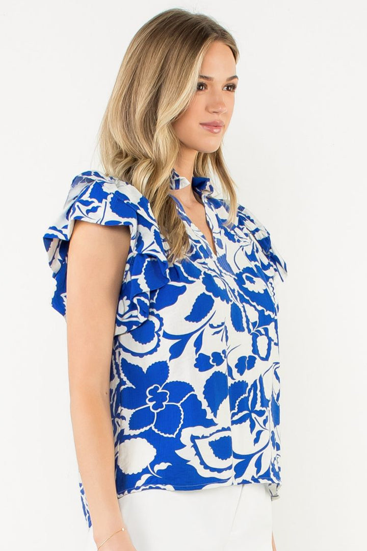 Expertly crafted from a lightweight linen blend, this Flutter Sleeve Print Top is adorned with a vibrant blue floral print that is perfect for any work or date night outfit. The v-neckline and ruffle flutter sleeve add a touch of elegance and sophistication. Stay cool and stylish while making a statement in this versatile top.