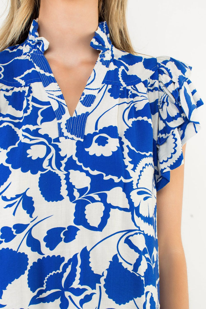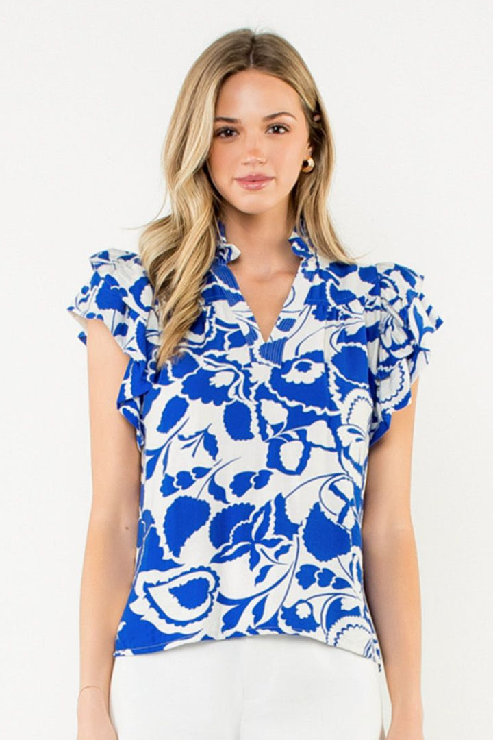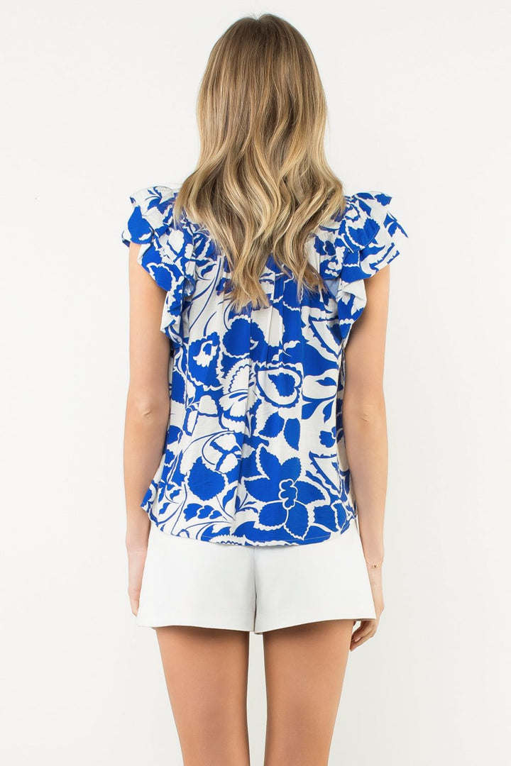 Flutter Sleeve Print Top—Blue/Cream **Final Sale**