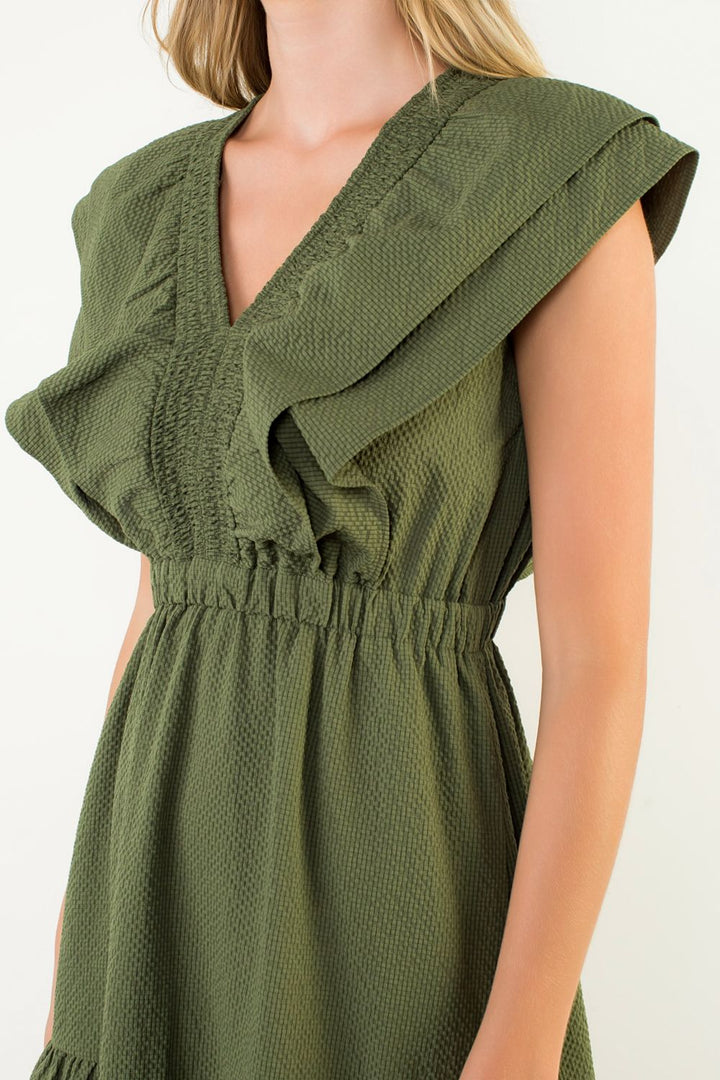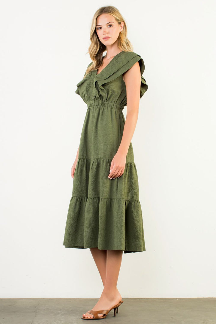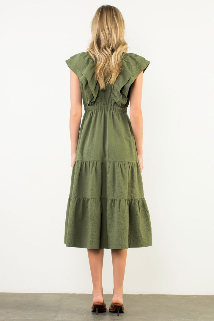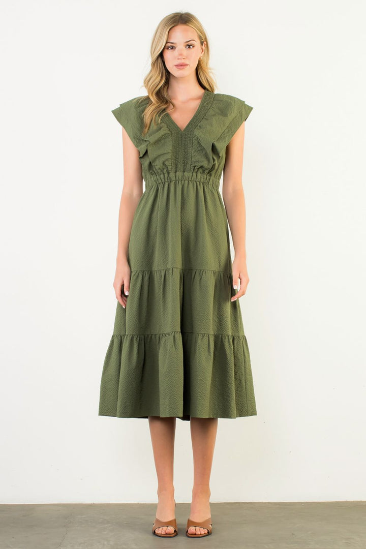 Flutter Sleeve Tiered Midi Dress- Olive Green
