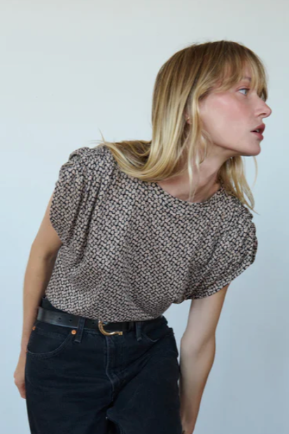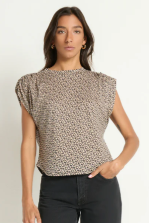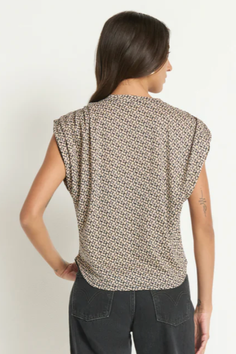 Elevate your everyday look with a luxe twist on our classic cool-girl muscle tank. Featuring delicate shirred shoulders for a touch of elegance, this dressier version shines in the playful Ditsy Floral Butterscotch print. Perfect for adding smooth sophistication to your warm-weather wardrobe.