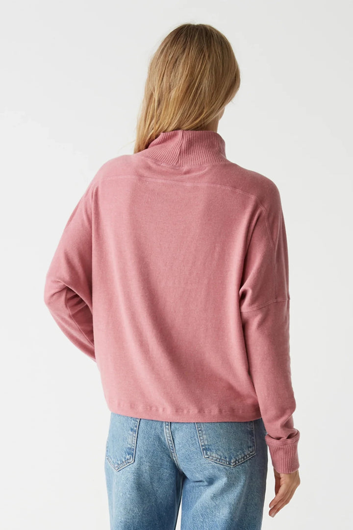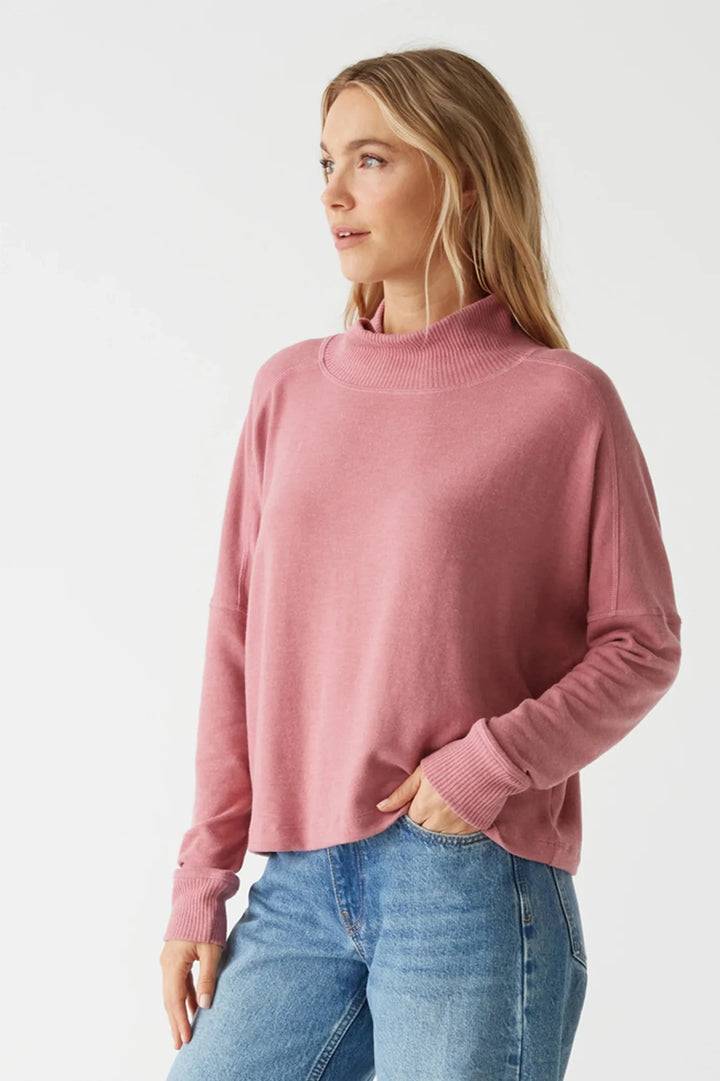 Elevate your everyday style with our Frida Mock Neck Top in Berrywood. Its soft jersey fabric and ribbed mock neck provide comfort and a touch of sophistication. With a dropped shoulder and boxier fit, this top adds a trendy spin to any outfit. Plus, its dusty pink hue adds a pop of color to your wardrobe.