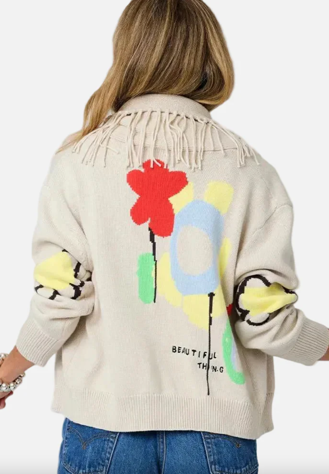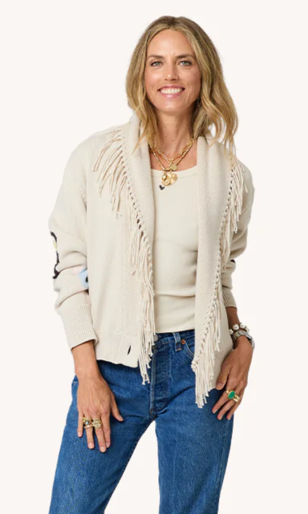 A little bit of fringe, a whole lot of heart. The Fringe Shawl Collar Cardigan brings Kerri's 'Beautiful Thing' artwork to life through intarsia knitting on the back and cuff. Featuring a double-button closure and relaxed fit, it transitions effortlessly from casual denim pairings to dressed-up moments with the KR Tank Dress. Crafted from 100% cotton knit and imported for quality. True to size with a 21" body length.