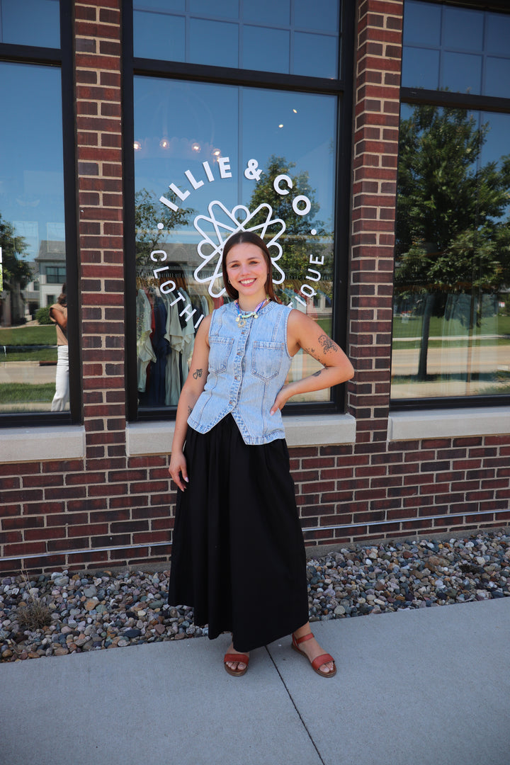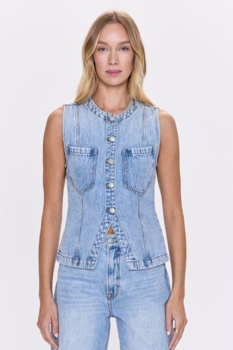 The Gia Denim Vest in Gaze is a summer essential featuring a structured design and button-front closure for a polished look. Its versatile style pairs effortlessly with skirts or matching jeans, making it a smart addition to any warm-weather wardrobe. Crafted for both comfort and durability, this vest elevates casual outfits with a refined edge.