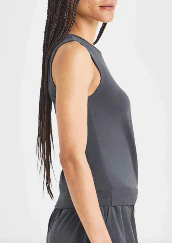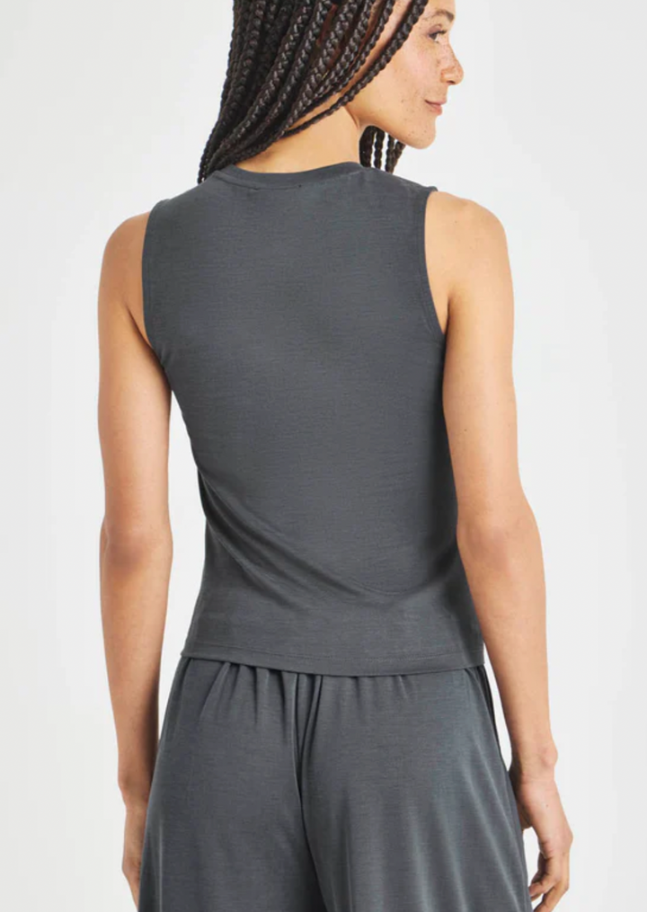 The Giada Sandwash Tank has sophisticated design without ever sacrificing comfort. Made from soft lightweight sandwash jersey in a simple sleeveless crewneck silhouette with an elevated twist design at the hem. Top it over the Giada Sandwash Palazzo Pant for polished comfort.