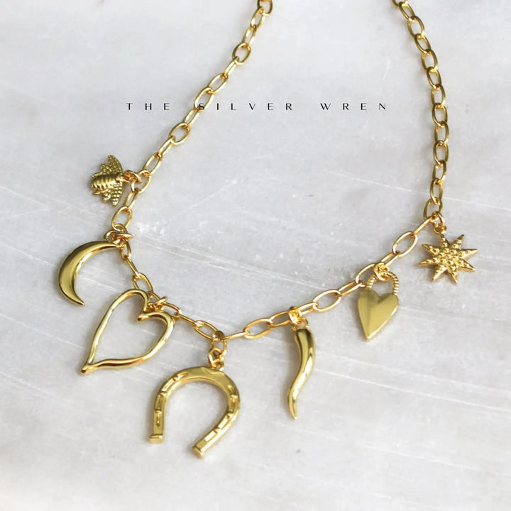 Add a playful spark to your look with this Gold Multi Charm Necklace! Featuring seven unique gold-plated charms on a thick 17-inch 18kt gold-plated chain, it’s designed to shine without fading. Safe, water-friendly, and free from lead, nickel, and cadmium, this necklace is your new go-to statement piece that’s as fun as it is fabulous.