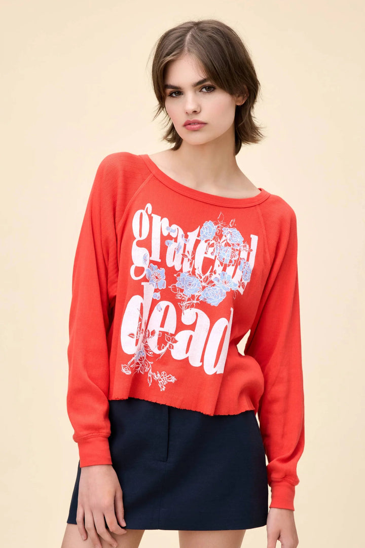 Immerse yourself in the timeless music of Grateful Dead with this radiant watermelon raglan. Featuring captivating lyrics and extended shows, their countercultural leadership earned them a devoted fanbase. Embody their spirit with this pointelle long sleeve, adorned with blooming flowers and the iconic band's name.