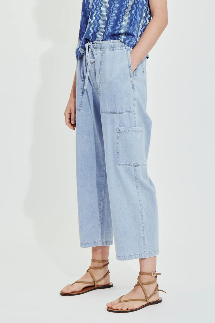 The Griffith Chambray Cargo Pant is a summer wardrobe essential crafted from lightweight chambray fabric for breathability and comfort. Its cropped length and drawstring waist offer a tailored yet relaxed fit, while the practical patch pocket adds functional style. Ideal for warm-weather wear, this pant combines casual utility with refined design.