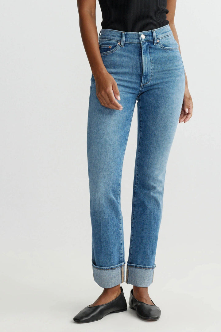 Halle is a high-rise, straight leg silhouette cut to a 29" inseam, engineered with DL1961's proprietary Instasculpt™ technology that smooths and sculpts to conform to your body's contours. The Spring Creek colorway delivers a bright, mid-indigo base with authentic vintage character—silver shank, copper rivets, and khaki stitching—finished with a functional cuffed hem and ecru back patch for refined detailing.