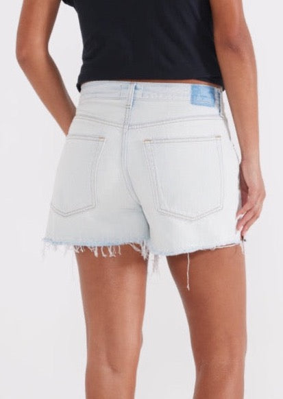Relaxed fit denim shorts in a light blue wash rinse, giving these cutoff shorts a vintage look. Featuring a 3.5" inseam, 11.5" front rise, distressed hemline and side slit opening. Pair with a classic tee, tank or wear with your swimsuit this summer.