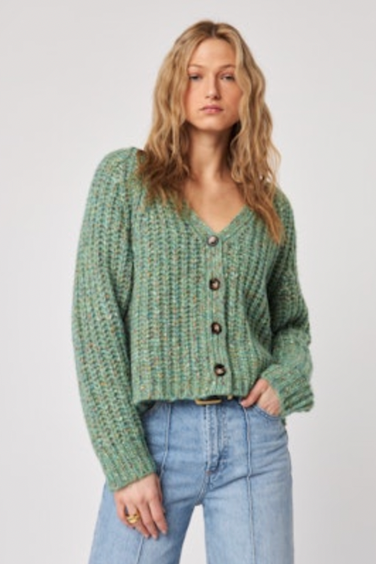 Cozy up in the Hawkins Cardigan—Sage Embers, featuring a charming ribbed texture and a marbled soft green hue that adds a touch of whimsy to your wardrobe. Perfect for layering on those cooler days, it effortlessly blends comfort with playful style to keep you warm without sacrificing flair.