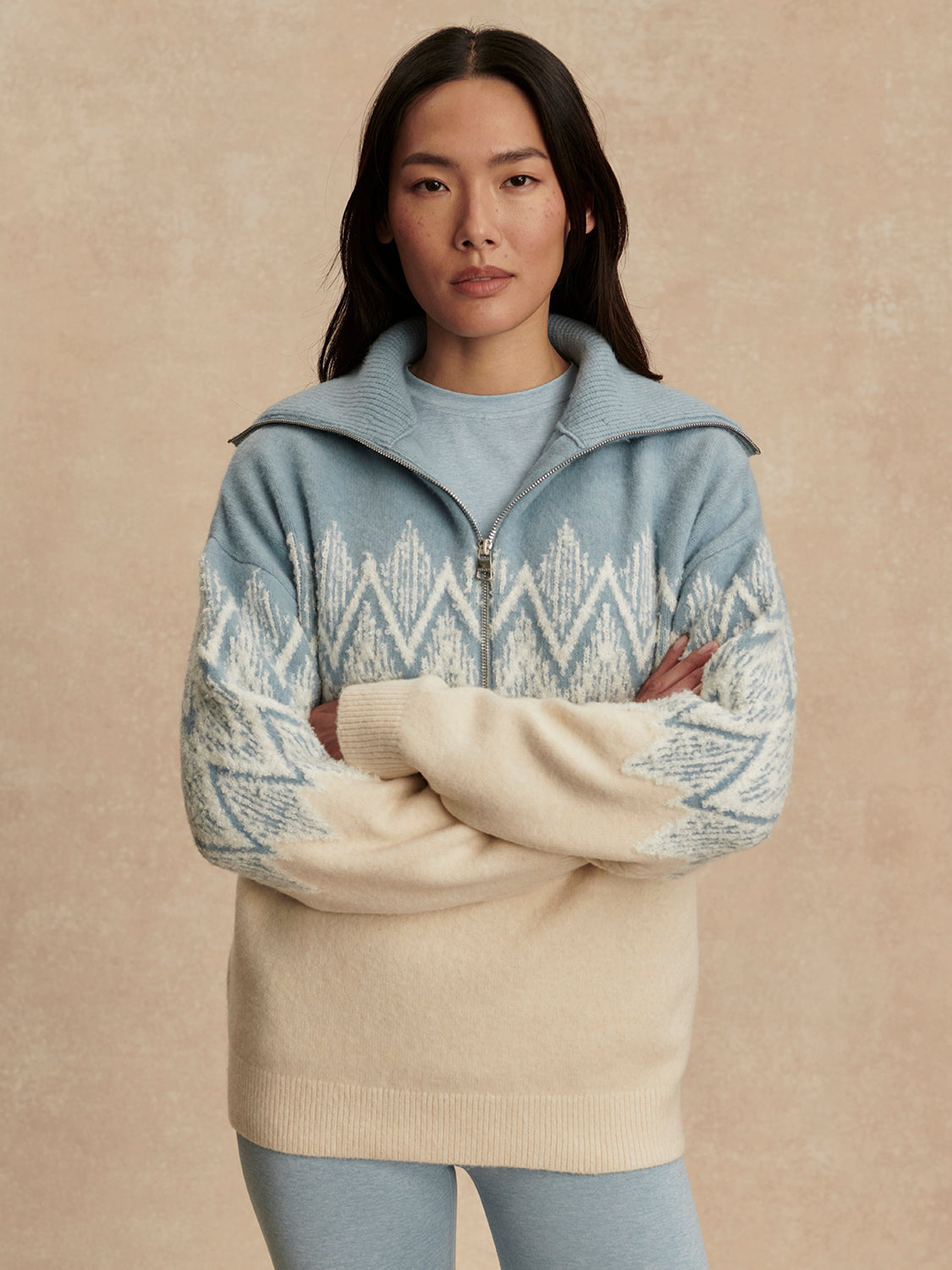 Wrap yourself in cozy charm with the Hedda Fairisle Half Zip, where soft baby blue meets creamy ivory in a timeless fair isle pattern. This playful pullover is your new go-to for effortless layering—pair it with leggings for a relaxed weekend vibe or throw it over jeans for instant comfort. Perfect for those moments when you want to feel snug without sacrificing style.