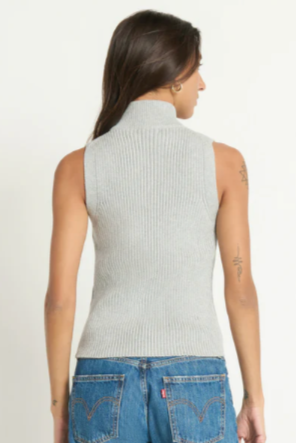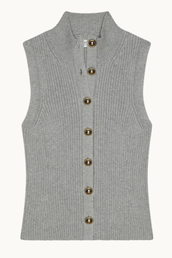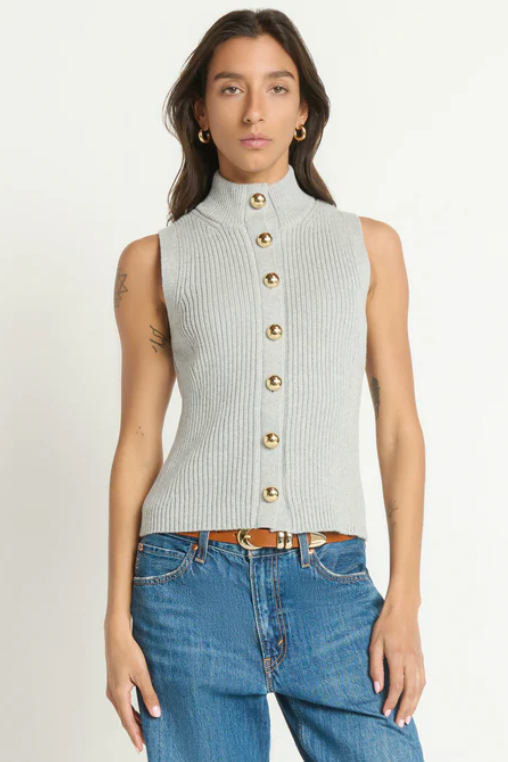 Cozy meets cool with the Ira Sweater Vest in Heather Grey. Crafted from soft cotton cashmere, this vest features a chic mock neck, luxe ribbing, and shiny gold dome buttons that add just the right touch of flair. Falling right at the hip, it’s perfect for layering with your favorite tees or shirts for a playful, polished look all season long.