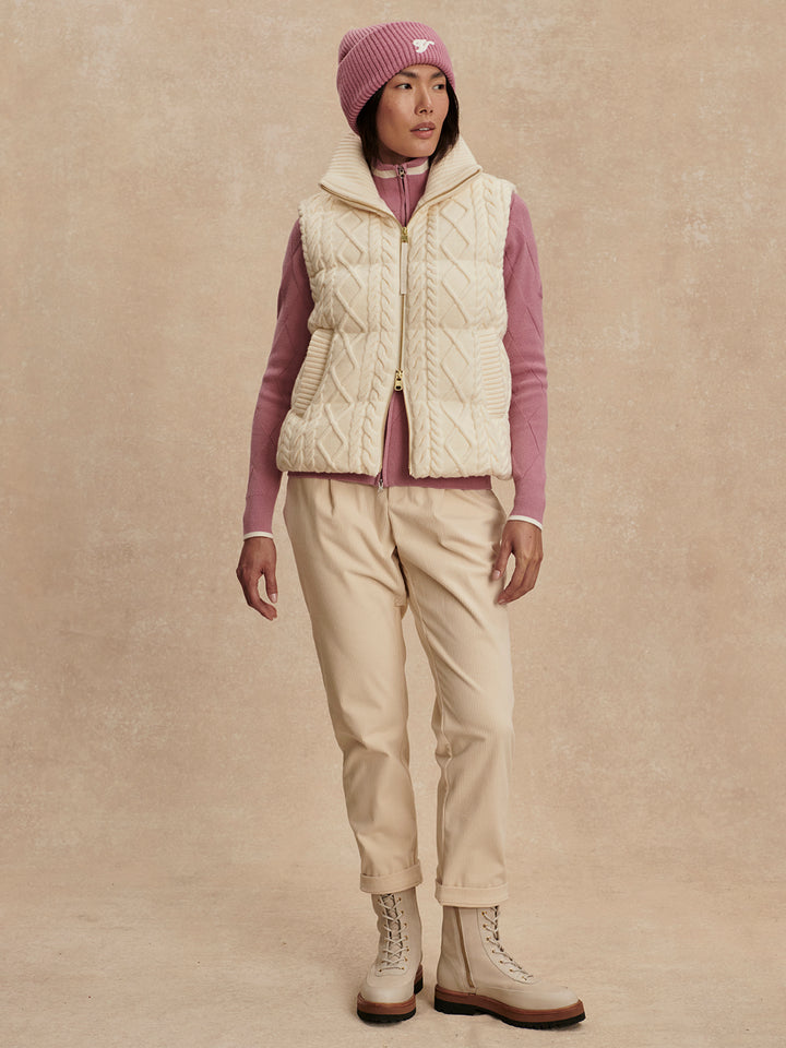 Layer up with the Irina Cable Knit Gilet in a soft, creamy egret tone that pairs with everything. This cozy puffer vest features a chunky cable knit exterior for texture and warmth, while a gleaming gold zipper adds a touch of shine. Perfect for throwing over your favorite sweater or dress, it's the effortless piece that takes any outfit from basic to brilliant. Stay snug, stay stylish, stay golden.