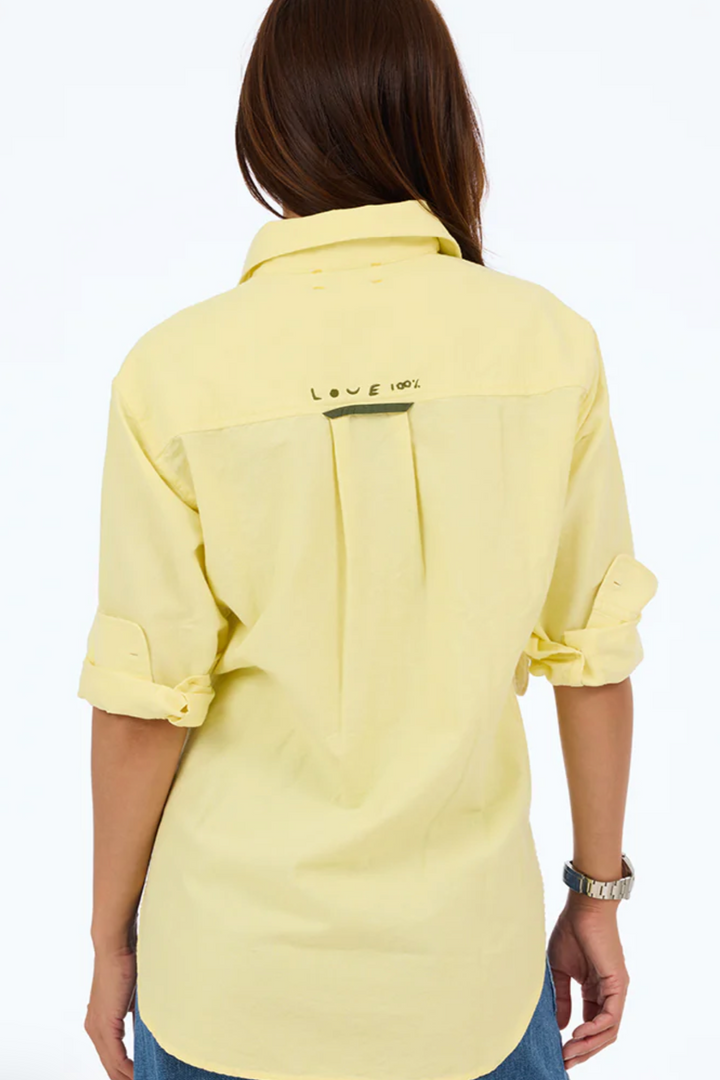 Brighten your look with the Jack Oxford Shirt, a sunny butter yellow button-up that’s anything but ordinary. Featuring a clever side cinch button, you can switch from classic to waist-cinched style in seconds. The army green accents add a unique twist, making this 100% cotton yarn-dyed Oxford shirt your new playful favorite. With a flattering 30" length in size small, it’s perfect for mixing up your wardrobe effortlessly.