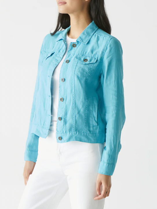 Look cool and stylish this season with our Jean Trucker Jacket in a bright blue hue. Crafted from linen, this lightweight jacket features pockets and button closure for easy wear. Be inspired to make a statement with this timeless look!