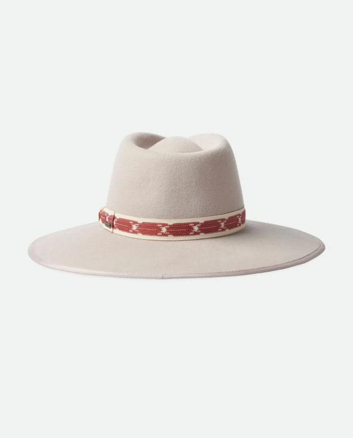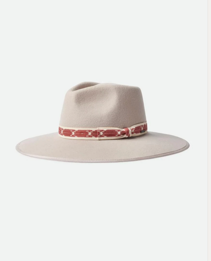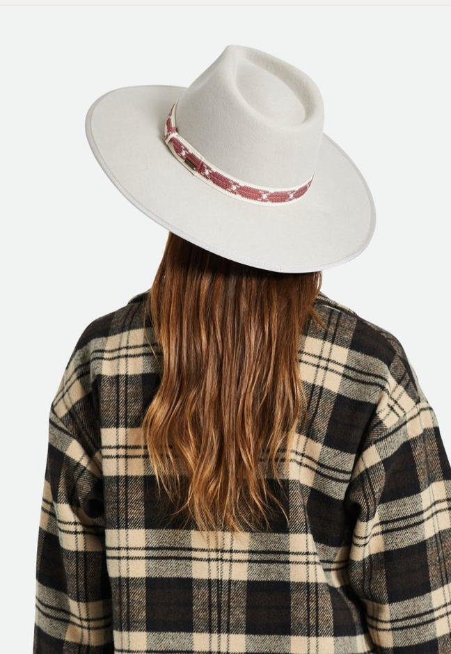 Wide stiff brim felt hat with a grosgrain contrasting band and metal headwear plaque. Adjustable Velcro strap under sweatband.