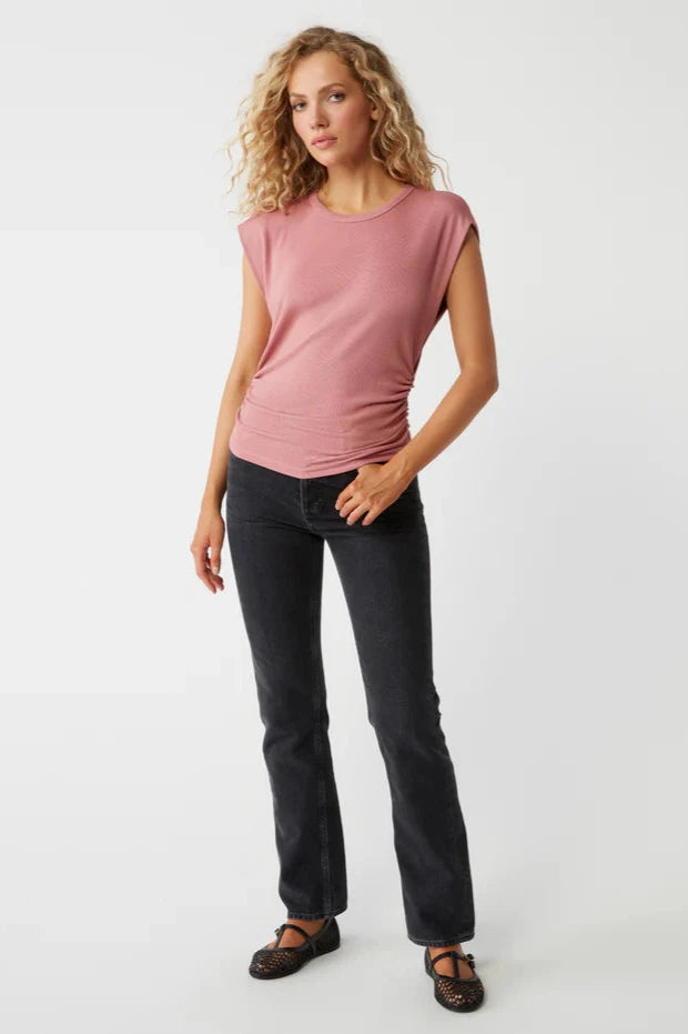 The Joni is the crew neck version of our best-selling Amara tee, featuring a power shoulder, slight crop, and ruching on the sides. Made from the softest Ultra Rib fabric that is meant to be washed and well loved for years to come. Soft dusty rose hue is the perfect transition color into fall.