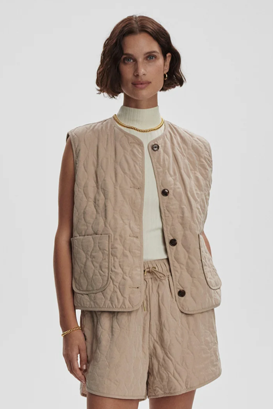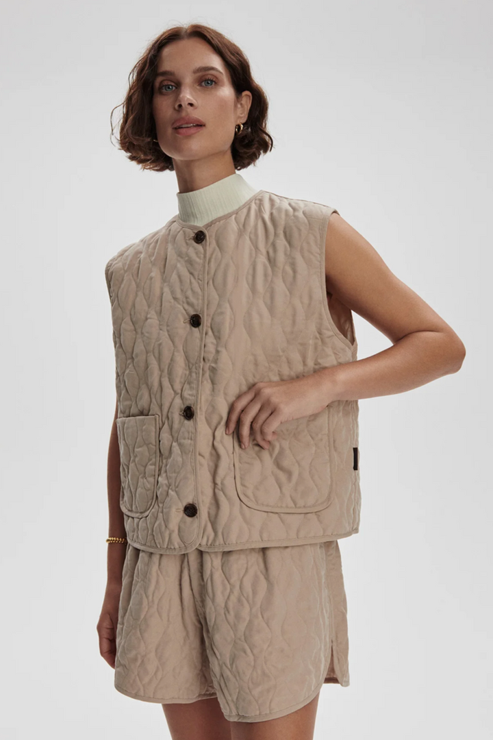 Expertly crafted from our Super Soft Quilted Twill, the Karla gilet boasts a lightweight synthetic fill for exceptional warmth and comfort. The contrast lining and branded button-front closure add a touch of luxury to this versatile piece. Complete the look with our matching Catrine shorts.