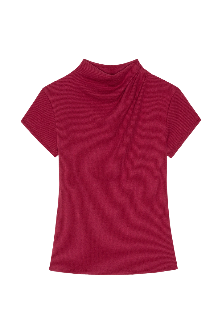 The Katie Draped Top brings effortless French-inspired elegance to your everyday rotation—think Parisian chic without the flight. Designed with our signature fit and a touch of stretch, strategic pleating and draping create a flattering silhouette from every angle. The mock neck and cap sleeves add polish and versatility, making this sangria beauty the perfect layering piece or standalone statement. Dress it up or down—it's ready for whatever your day demands.