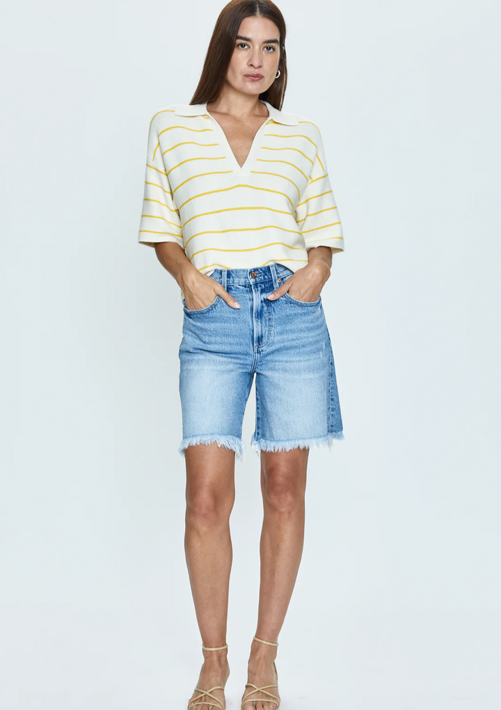 Get the perfect silhouette with Kaylee Long Cut-Off Shorts. The high-rise and pinch waist create a flattering look, while the comfort stretch denim and raw hemline maximize comfort. With a light blue wash and versatile styling options, these shorts are a must-have for any wardrobe.