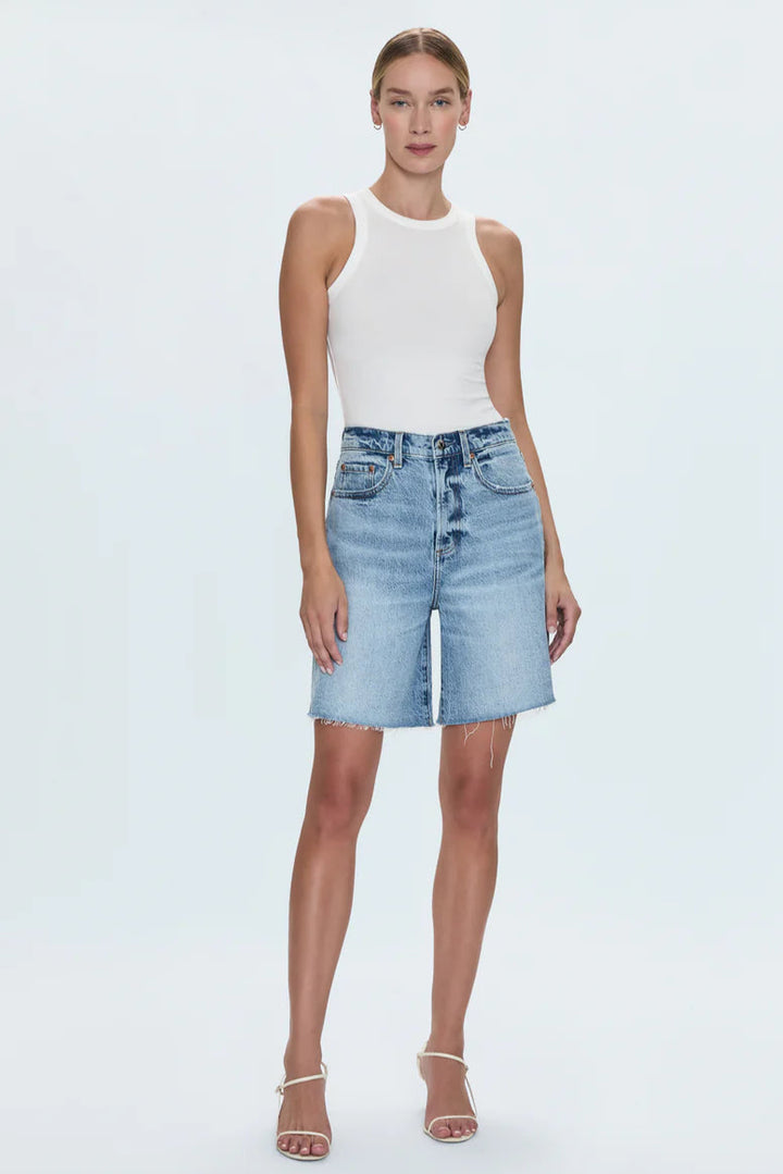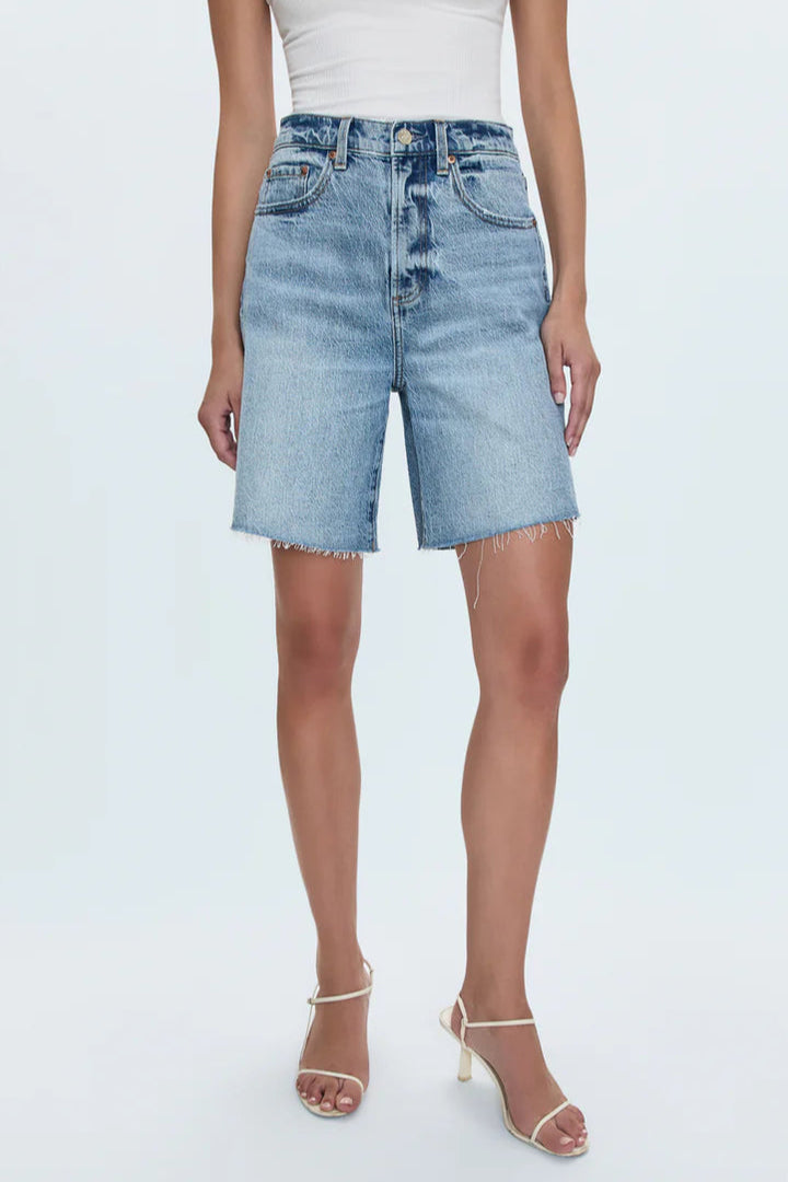 The Kaylee Shorts in Boulder feature a high-rise silhouette with a pinched waist that transitions into a long, loose-fit leg for a relaxed yet flattering look. Made from our signature comfort stretch denim, these shorts offer exceptional wearability for everyday use. The Boulder wash showcases a light blue hue with vintage-inspired fading, subtle whiskering, and a frayed hem, adding a timeless, lived-in character to your wardrobe.