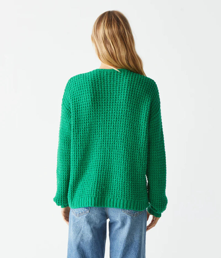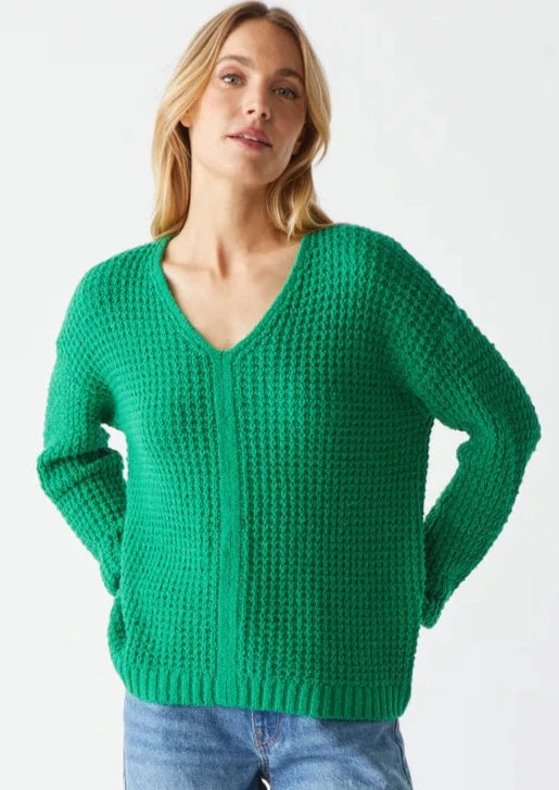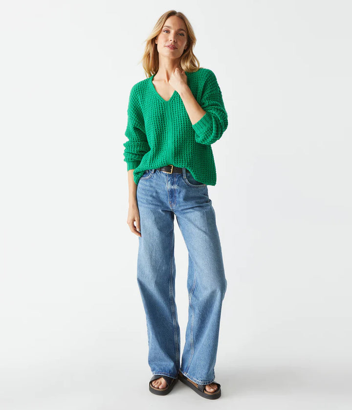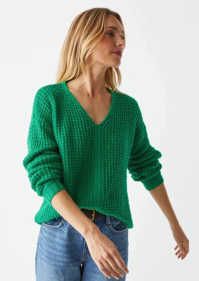 Elevate your wardrobe with our Kelsie V-Neck Pullover. This classic sweater features a unique waffle texture and center front seam, making it a stylish and versatile transitional piece for the warmer weather ahead. The bright Kelly green hue adds a vibrant touch to any outfit. Upgrade your spring wardrobe with this must-have item.
