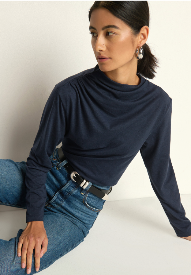 Effortlessly chic and endlessly versatile, the Kristen Tee in Night Sky is your new wardrobe MVP. Crafted from sumptuous luxe jersey cotton, this long sleeve top features a sophisticated mock neckline and a charming cinched drape detail at the shoulder that adds just the right amount of visual interest. Dress it up with tailored trousers for the office or keep it casual with your favorite jeans—this piece transitions seamlessly from day to night with zero fuss.