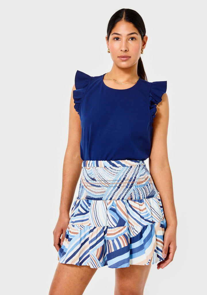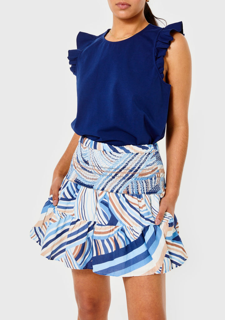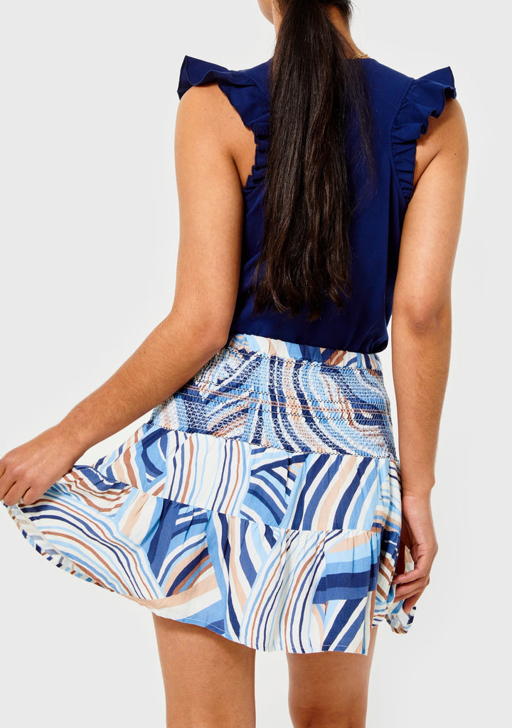 Get ready for summer with our new wave print linen skirt! The lightweight fabric is perfect for hot days, and the wide smocked waistband ensures a comfortable fit. Fully lined with convenient side pockets, this skirt can be dressed up or down for any occasion.