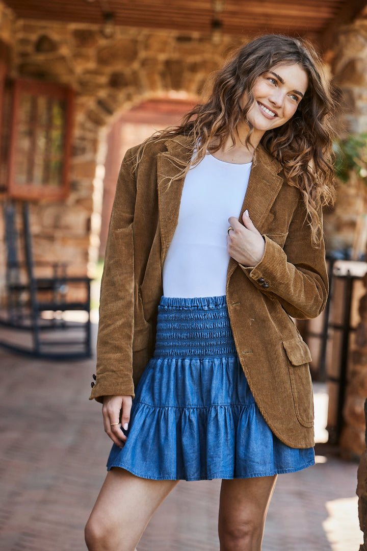 Our best-selling Kylie Skirt is back this Fall in an easy and wearable chambray fabric. Pairs with a plethora of shirts and sweaters. Try styling with one of our knit tops or dress up with our tweed Rowan blazer. Comfortable smocked waistband and side seam pockets. Custom print Smocked waistband Pockets Fully lined Pull-on skirt