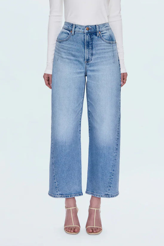 Meet your new favorite jeans with a playful twist: the Kyra Ankle Pant in Terrace. Sitting high on the waist with a flattering bowed leg and a cropped 28" inseam, these jeans add a fresh, modern vibe with a wide ankle opening. Unique seaming details, including a forward-twisted seam and chic back yoke, bring a stylish edge to classic denim. Made from comfy stretch fabric in a light, vintage-inspired wash, these pants blend timeless charm with contemporary flair. Perfect for adding a fun, confident touch to any outfit!