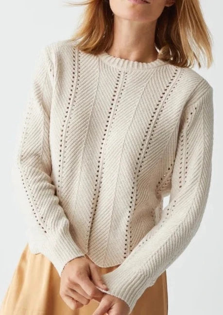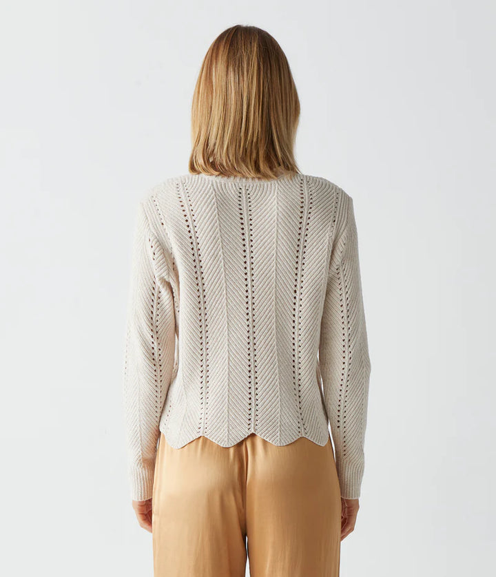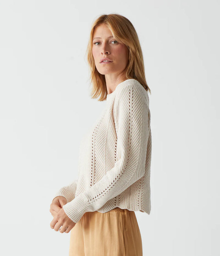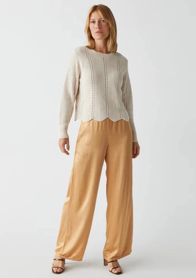 Experience ultimate comfort with our Lakin Cropped Crew Neck Pullover. Made with the softest chenille blend fabric, it features a classic fit and a scallop hemline for a chic and comfortable look. The lightest beige hue and pointelle knit detailing add a touch of sophistication. Upgrade your wardrobe today!