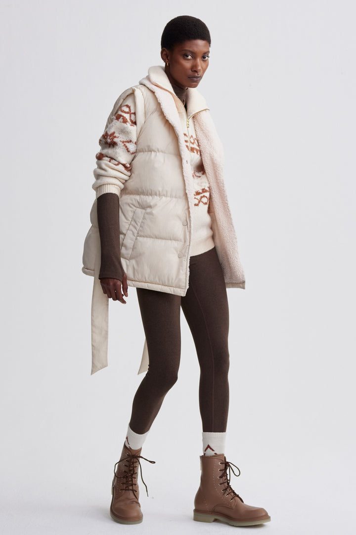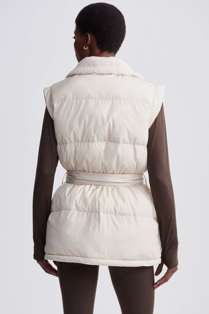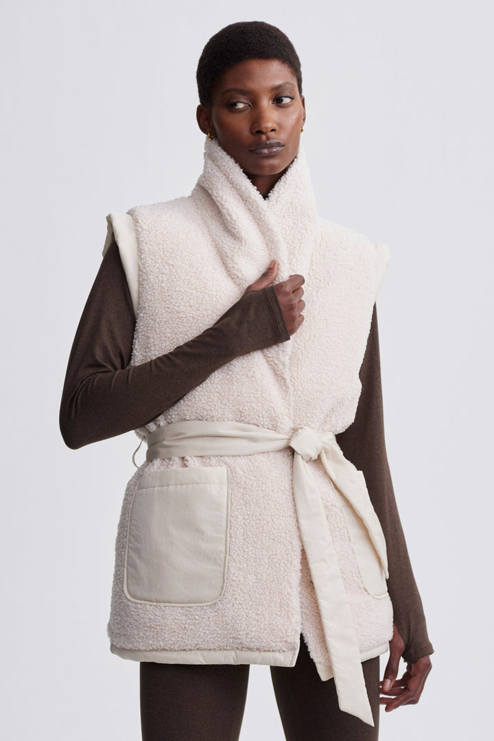 Introducing the Lanville Reversible Gilet - Sandshell, a must-have for versatile sophistication. This unique gilet features a reversible design, wrap style, and shawl collar, made from Boucle Sherpa and Crinkle Shell Nylon. Layer over anything for effortless style.