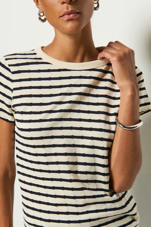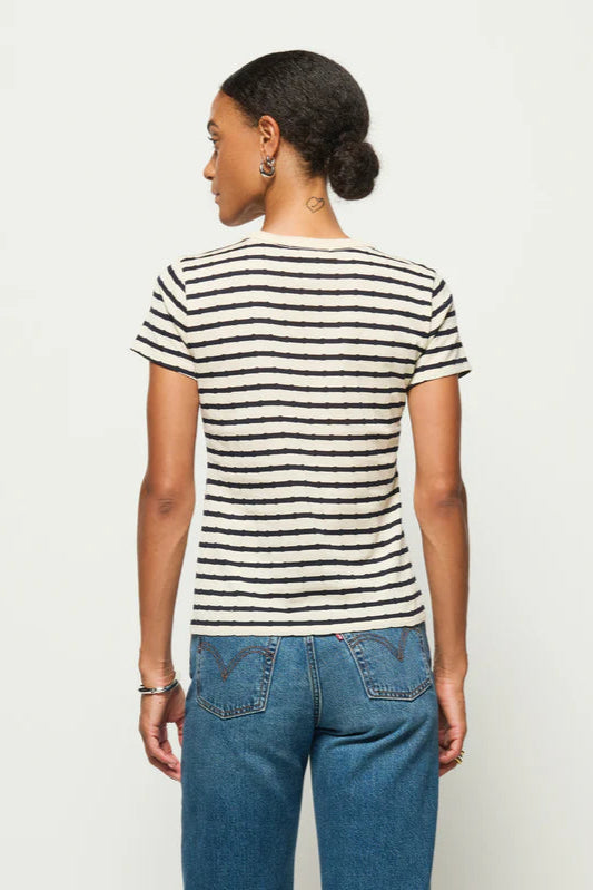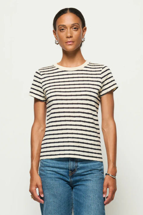 Introducing the Laurence Vintage Tee in Night Sky Stripe. With a contrast ribbed crew neckline and fitted silhouette, this shrunken baby tee is the perfect blend of vintage and modern. Complete your look and feel confident with its cap sleeves. Pairs well with the matching skirt.