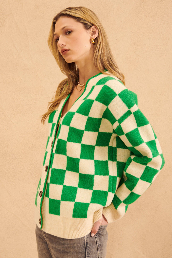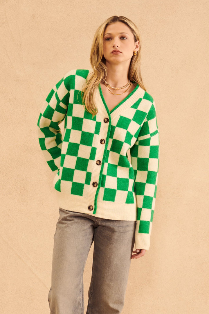 Step out in style with our Lawson Checkered Cardigan - Irish Check! This fun and bold cardigan features a bright green and cream hue, perfect for adding a pop of color to your wardrobe. With its oversized fit and button front, this cardigan is both trendy and versatile. Get ready to turn heads in this playful and stylish piece!