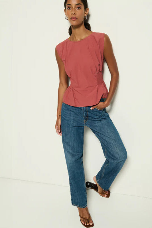 The Lela Pleated Peplum Top in Marsala offers a flattering silhouette with expert design details. Its smocked elastic bodice ensures a comfortable, form-fitting shape, while the crew neckline and flared peplum hem add a touch of refined femininity. This top effortlessly balances style and comfort, making it a versatile choice for both casual and dressier occasions.