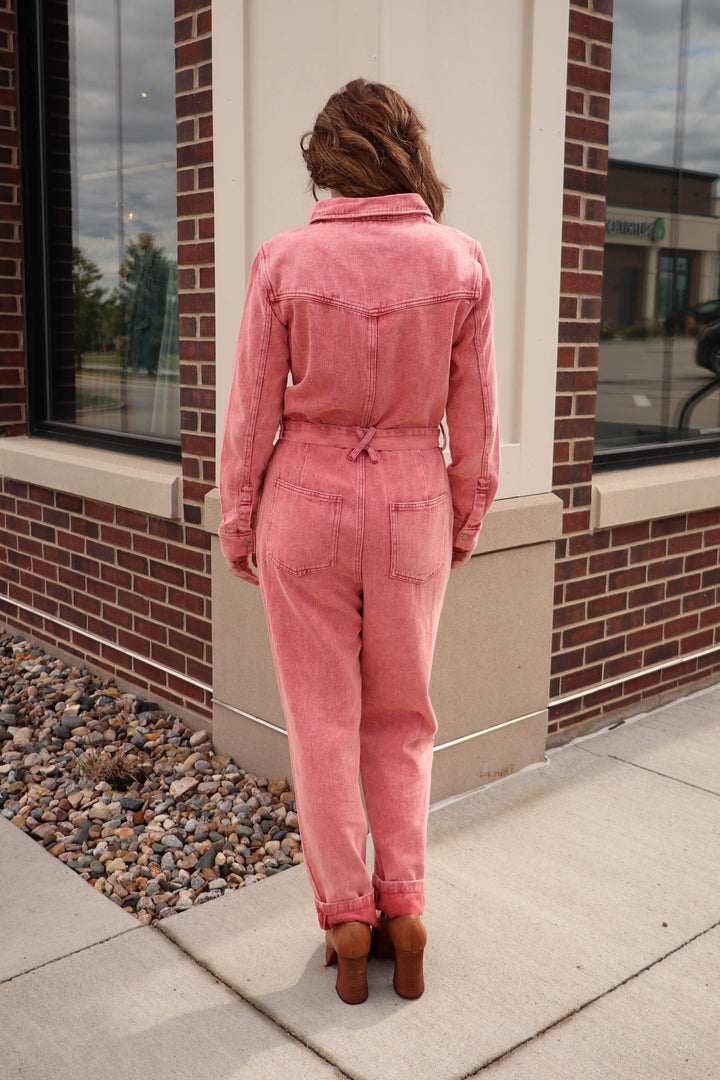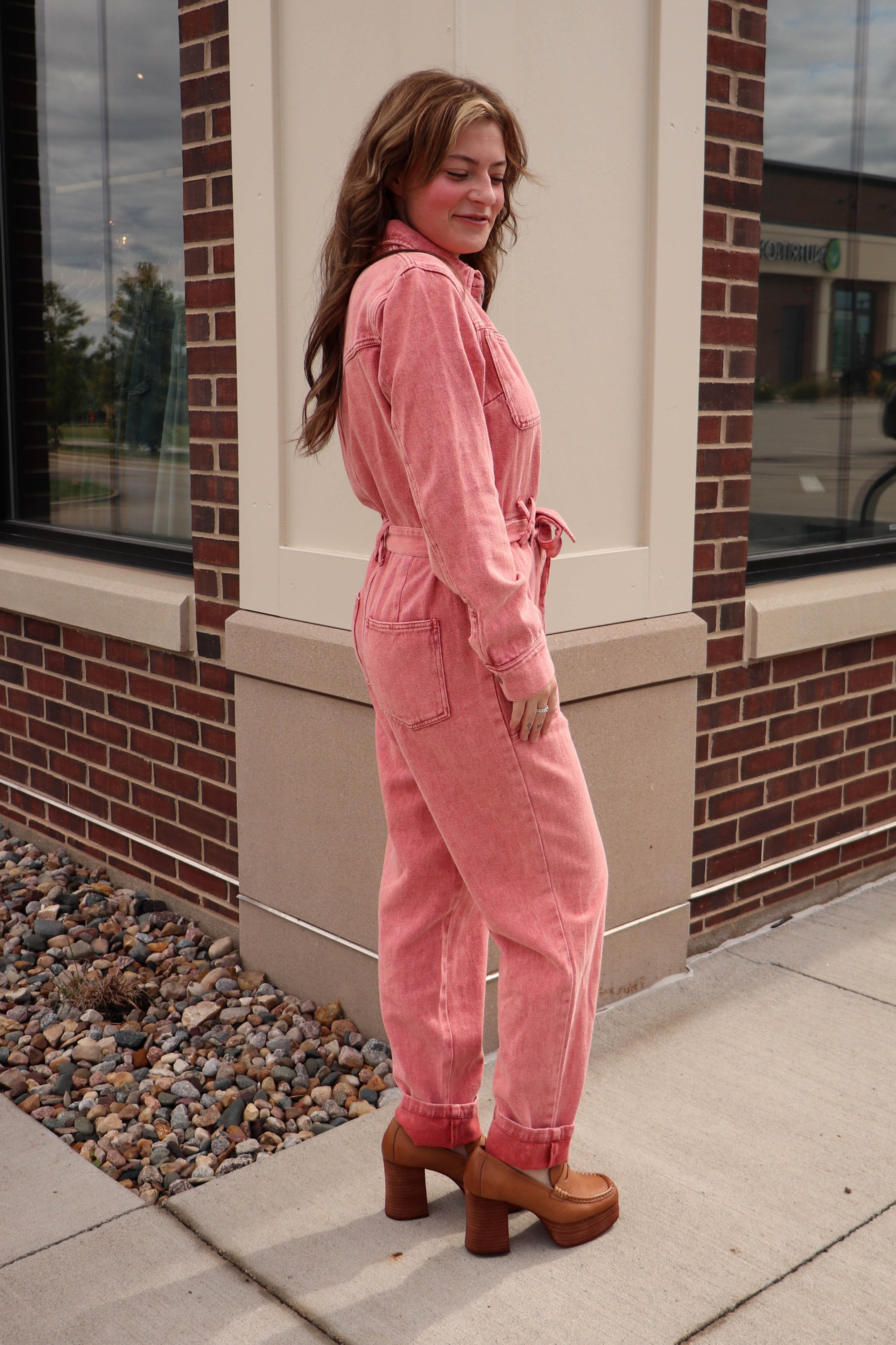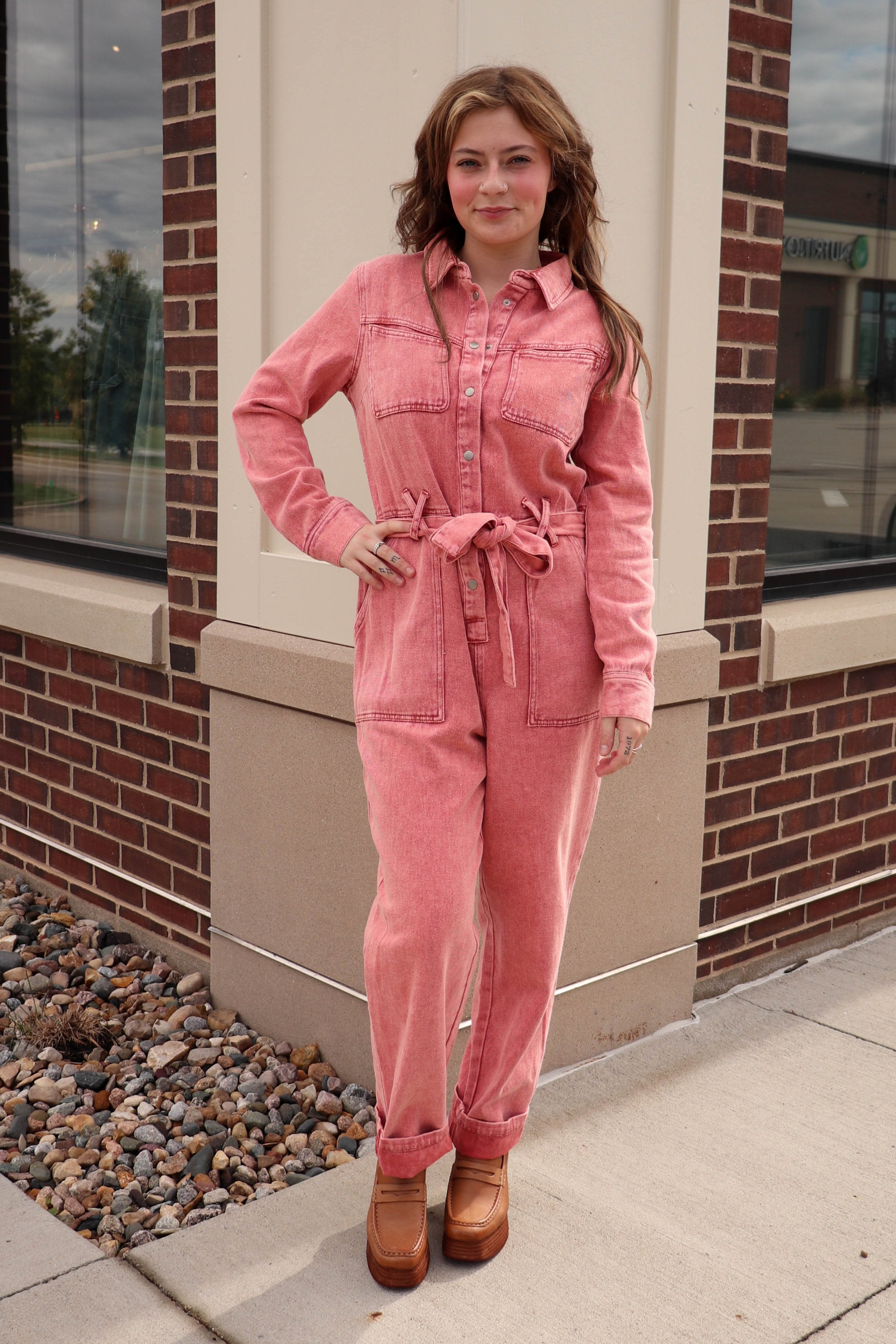 The perfect fall piece this season! This jumpsuit from Skies Are Blue is a pinkish/rust color that just captures the colors of the season beautifully. Grab yours today online or in store! True to size.