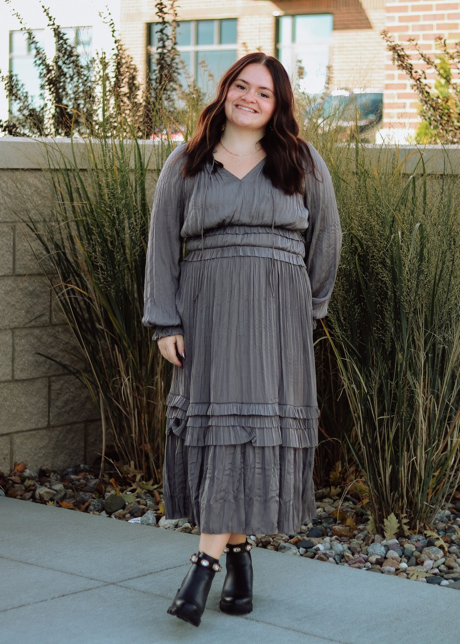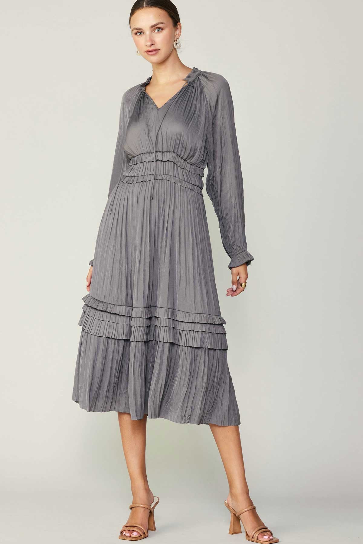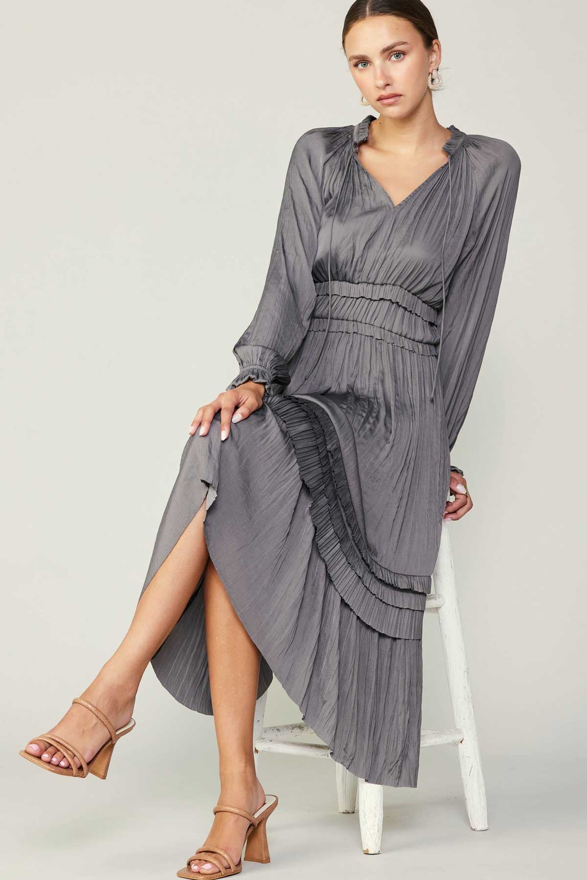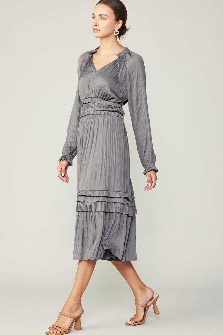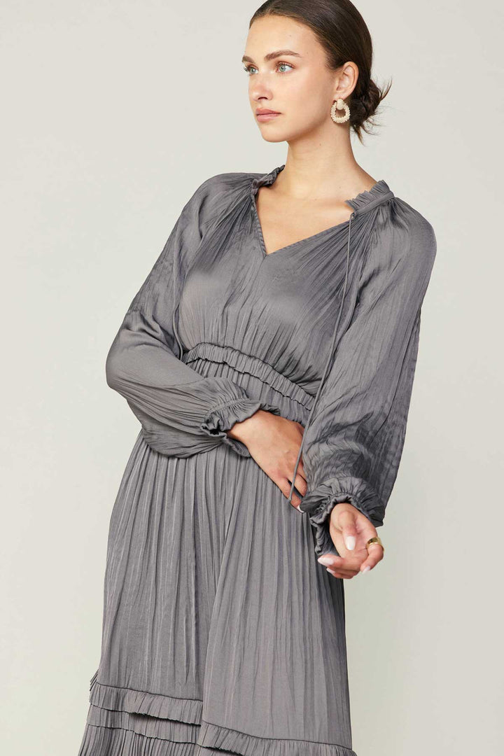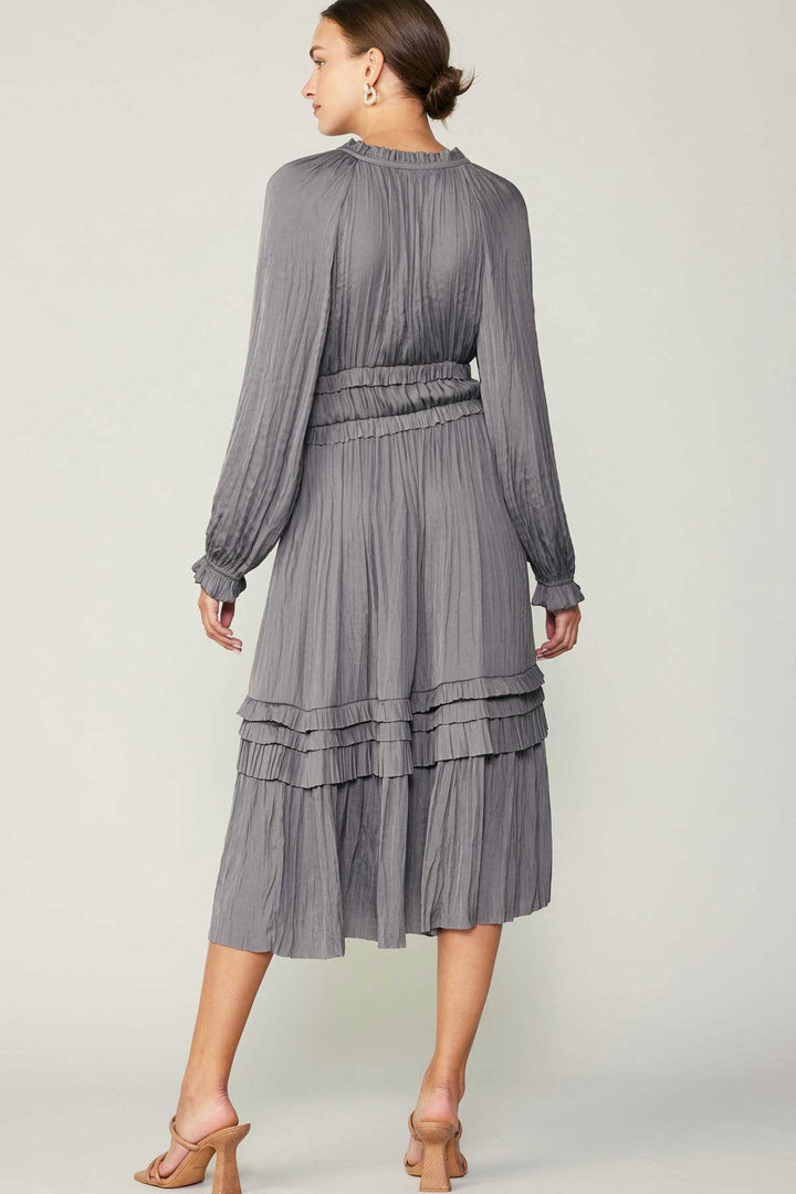 Long Sleeve Ruffle Detailed Midi Dress- Grey