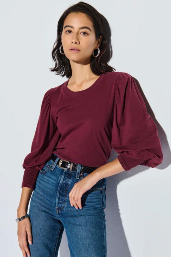 Introducing the Loren Peasant Tee in Bordeaux. Made from comfortable cotton, this tee boasts an exaggerated shoulder, 3/4 length sleeves with volume, and smocking details for a feminine touch. Perfect for when you want to look fancy without sacrificing comfort.