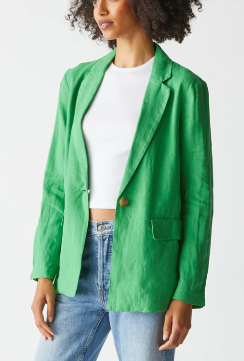 An effortless layer to add to your wardrobe this spring/summer. Menswear inspired, this relaxed fit blazer features front flap pockets, notched lapel and a single button closure. Roll up the sleeves and pair with a classic white tank and denim for an easy weekend style.